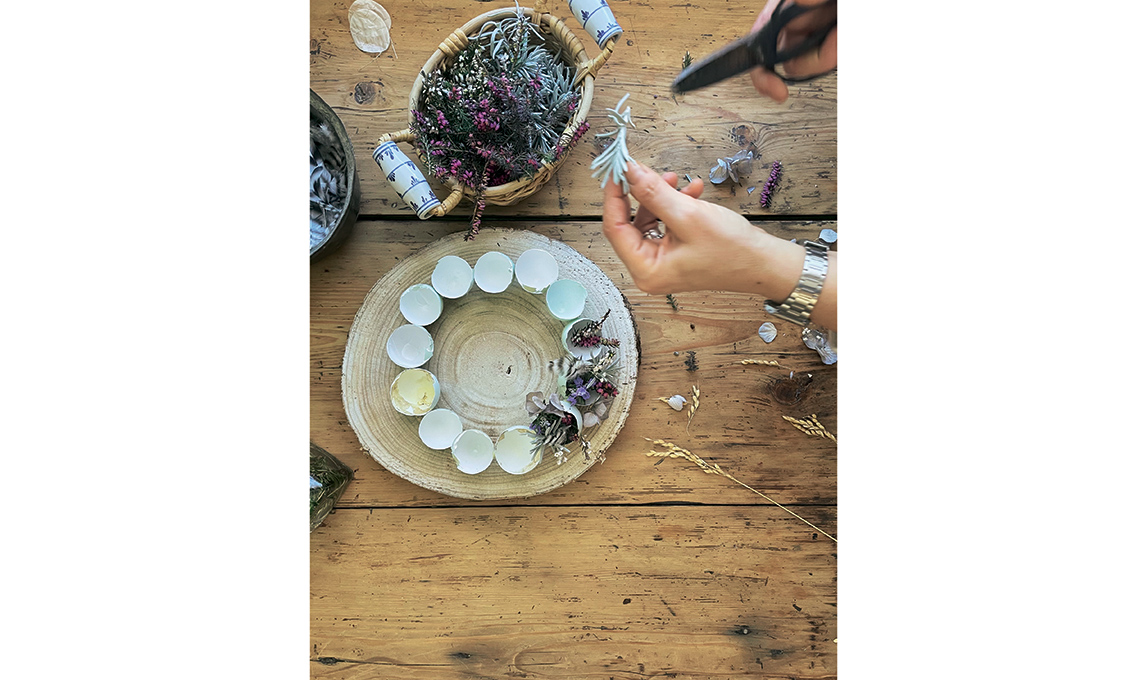 - Inserisci all’interno dei gusci gli elementi floreali e decorativi come le piume.