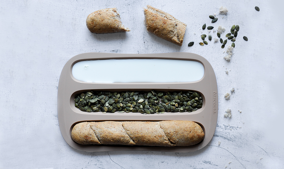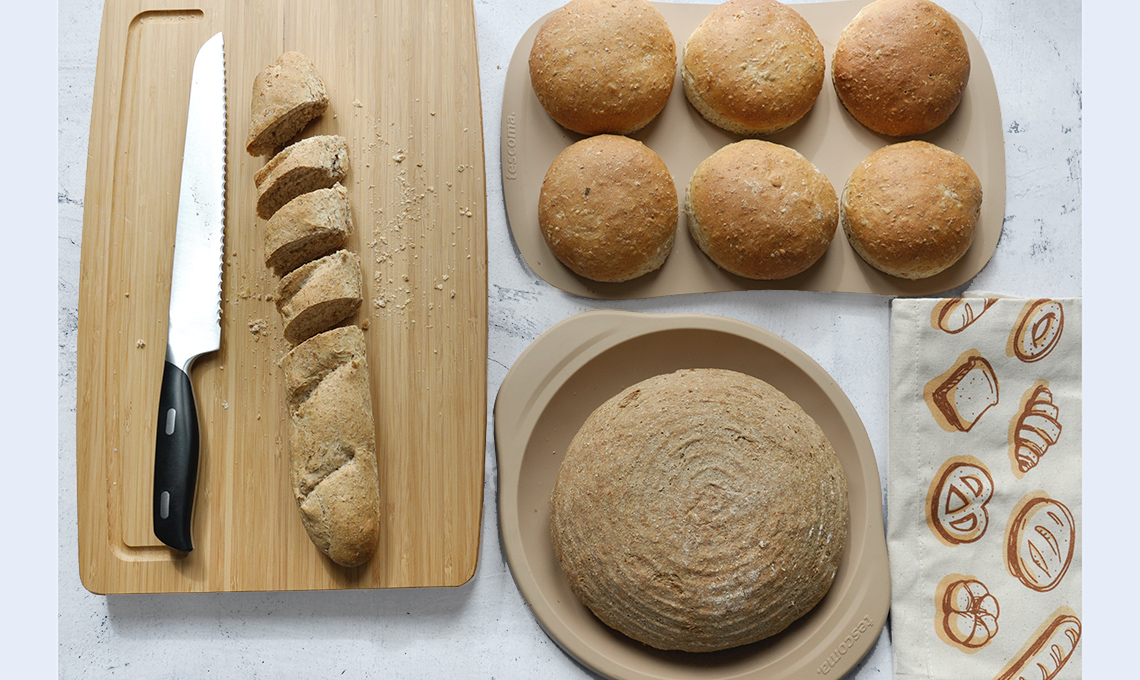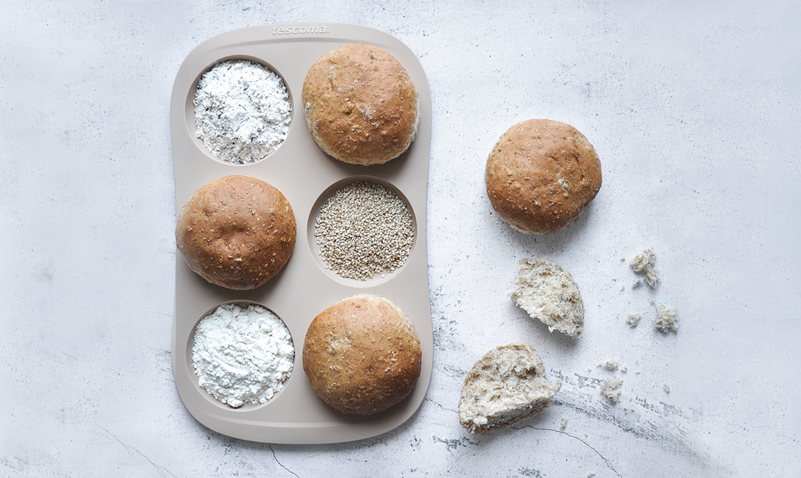 Il punto di partenza è la ricetta: quando si descrive una procedimento, bisogna già immaginare la foto. Il colore principale può venire da un ingrediente particolare, da un contrasto o da un utensile. In questo caso, trattandosi di pane, gli stampi di Tescoma sono risultati perfetti, soprattutto per il color sabbia, che si armonizza bene con il contesto. Nella foto si possono seguire anche diverse sfumature dello stesso colore. I piatti, i contenitori e le posate devono avere colori neutri o pastello per risultare gradevoli e per non sovrastare i colori della ricetta.
