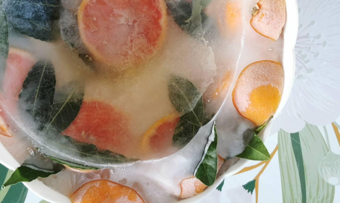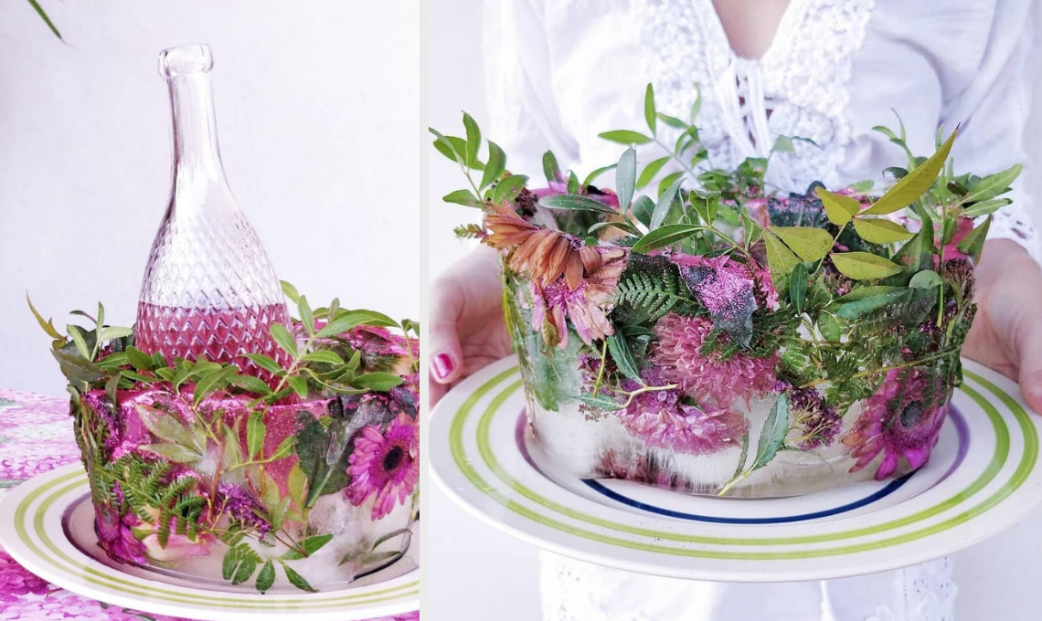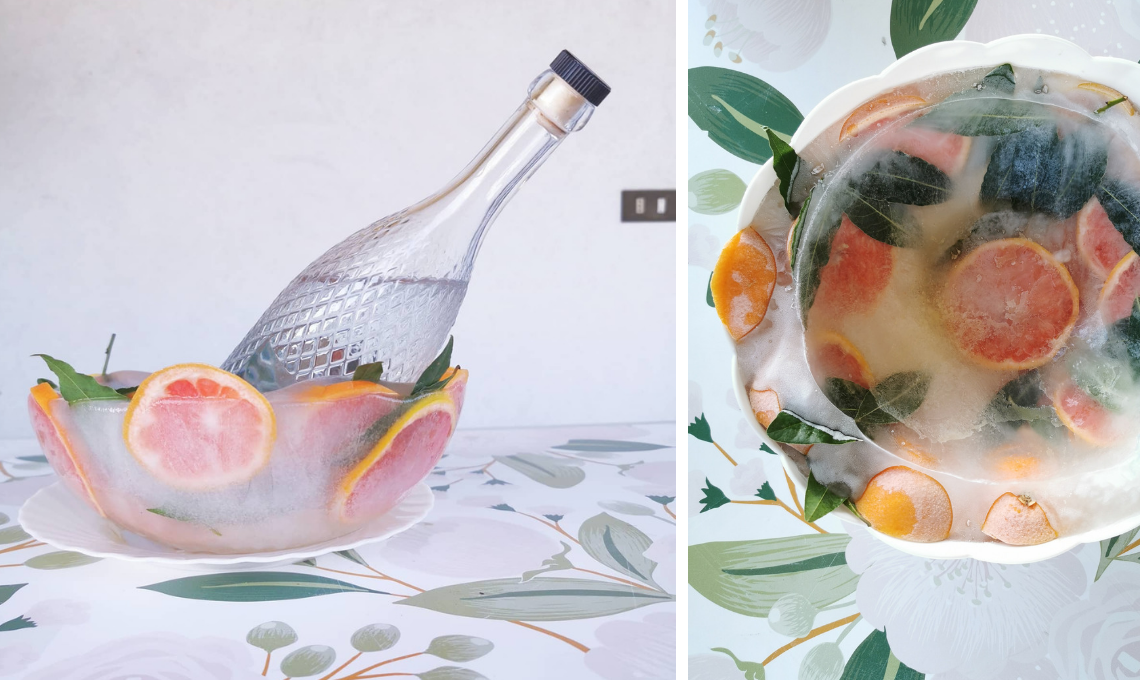 Queste ciotole di ghiaccio e frutta sono perfette per le feste in giardino, si scioglieranno lentamente appoggiate su un piatto da portata o direttamente sul prato. Sono colorate, botaniche e possono essere completamente personalizzate. Immagina fragole, fiori o perché no, in versione invernale con l’ago l’eucalipto.