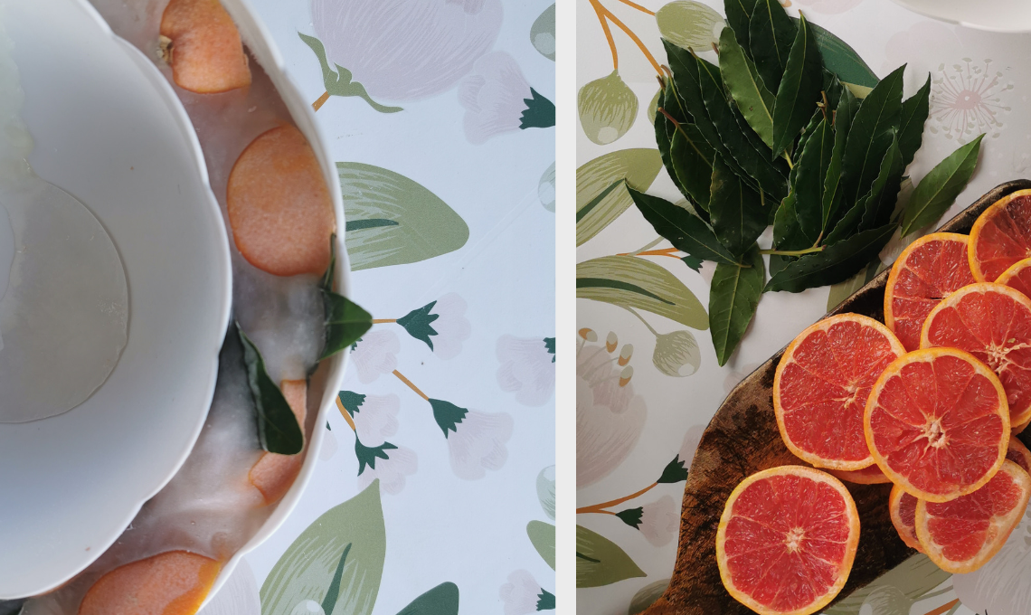 - Lava bene i pompelmi e le foglie di alloro. Taglia la frutta a fette.