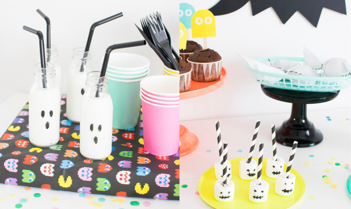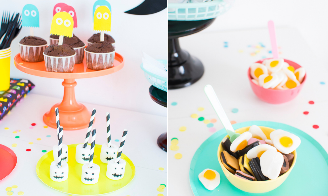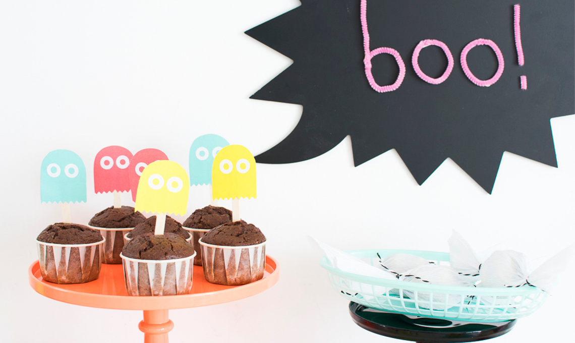 Per realizzare i topper fantasmino che decoreranno il vostro buffet vi serviranno cartoncini colorati, occhielli adesivi per fogli ad anelli, bastoncini in legno, colla e forbici. Disegnate una sagoma ispirandovi al fantasmino del famoso videogioco Pac-Man. Ritagliate i bordi, e incollate gli occhielli adesivi che saranno i loro occhi.
