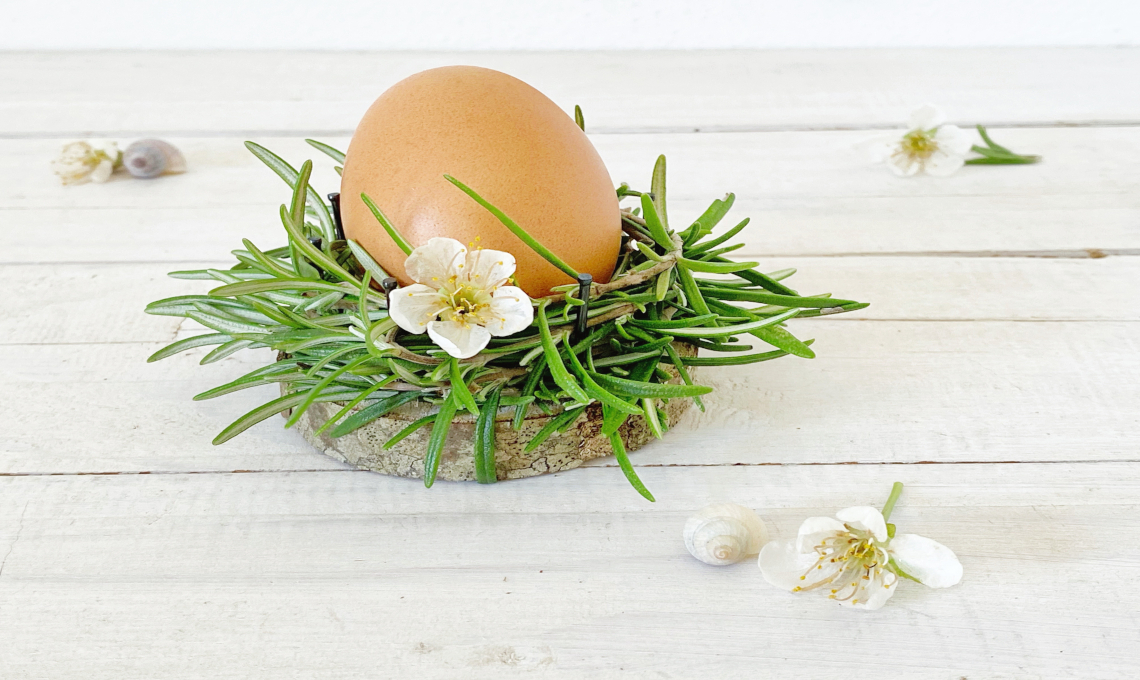 Realizza una decorazione semplice e versatile per la tavola di Pasqua con un dischetto di legno e dei rametti di rosmarino. Avrai un piccolo nido dall’effetto naturale ed elegante, fatto con quello che trovi a casa!