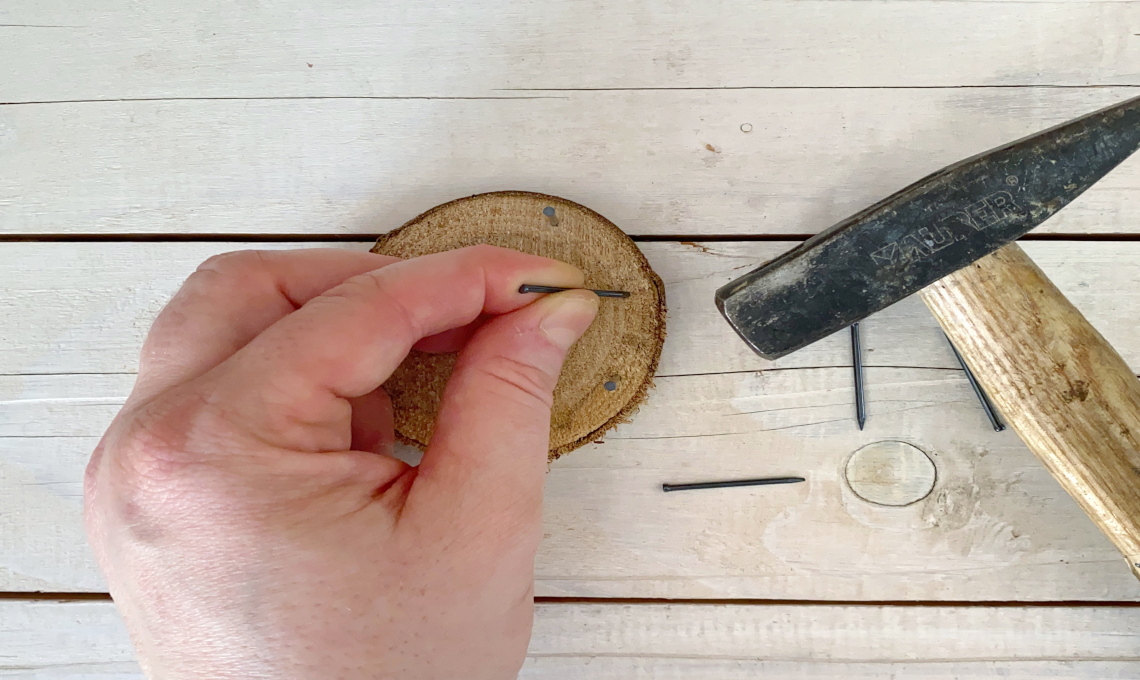 Col martello, inchioda i chiodini al dischetto di legno lungo la circonferenza. Stai almeno a circa mezzo cm dal bordo esterno e affonda nel legno non più di mezzo cm (comunque, il chiodo deve essere ben saldo e non dondolare). Per posizionarli più meno alla stessa distanza, inchioda prima quelli ai 4 poli e poi quelli a metà. Come vedi dalla foto, non è necessario che siano perfettamente dritti, perché poi verranno nascosti dal rosmarino.