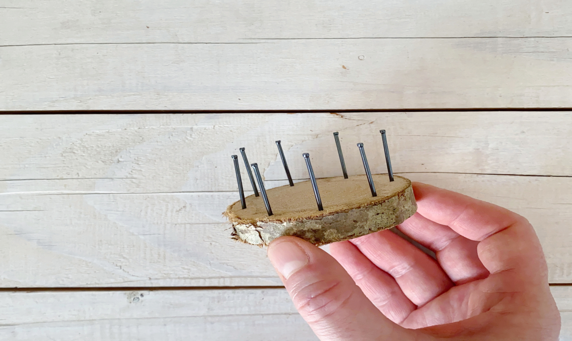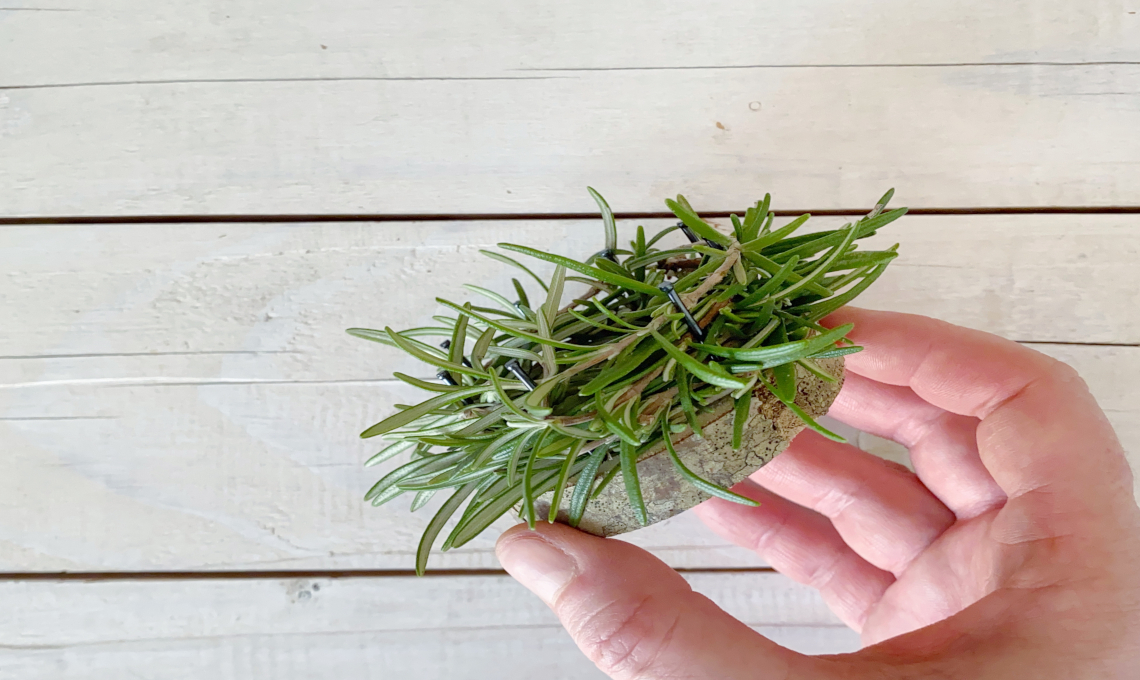 Intreccia i rametti di rosmarino, passando all’esterno e all’interno dei chiodi come un serpente. Man mano che procedi, spingi delicatamente i rametti verso il basso. Continua finché avrai riempito fino alla testa dei chiodini. Il tuo piccolo nido è pronto per accogliere un uovo!