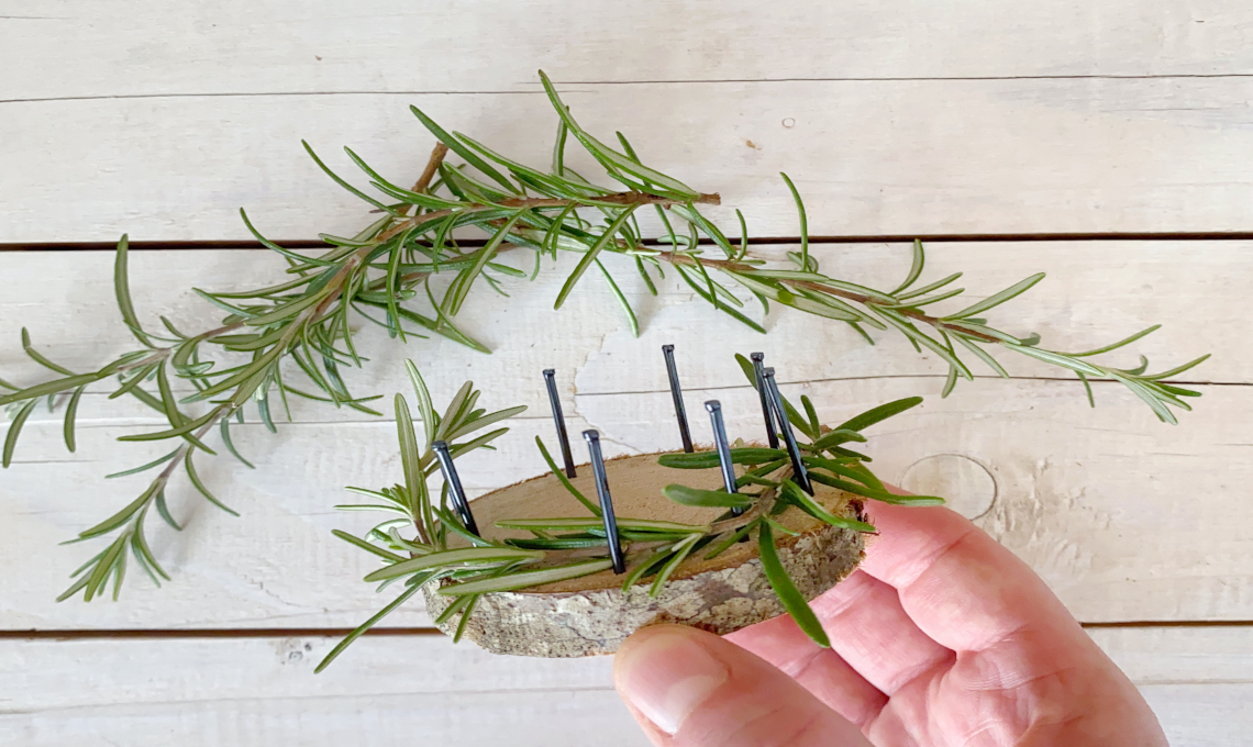 Intreccia i rametti di rosmarino, passando all’esterno e all’interno dei chiodi come un serpente. Man mano che procedi, spingi delicatamente i rametti verso il basso.