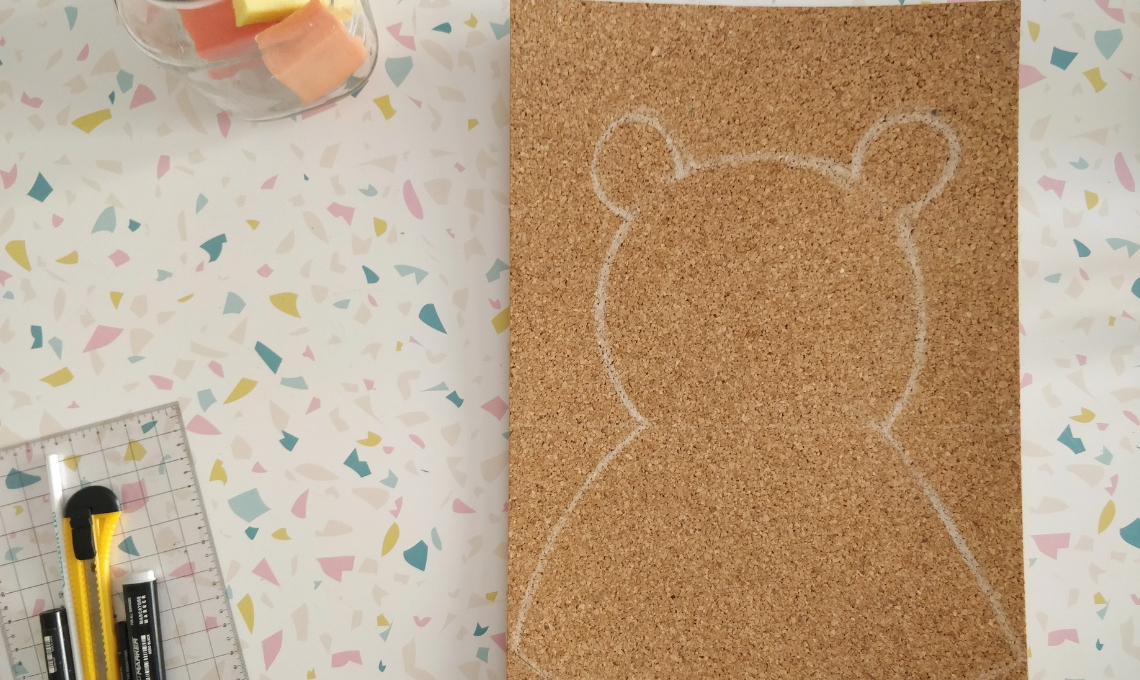 - Per disegnare la forma dell’orsetto potete utilizzare due metodi. Vi basterà trovare un’immagine sul web, e usarla come dima, oppure, se avete un pò di abilità nel disegno, potete disegnare la sagoma a mano. Io mi sono trovata molto bene ad utilizzare la penna gesso perché basta una spugnetta leggermente bagnata per cancellare i segni e gli errori.