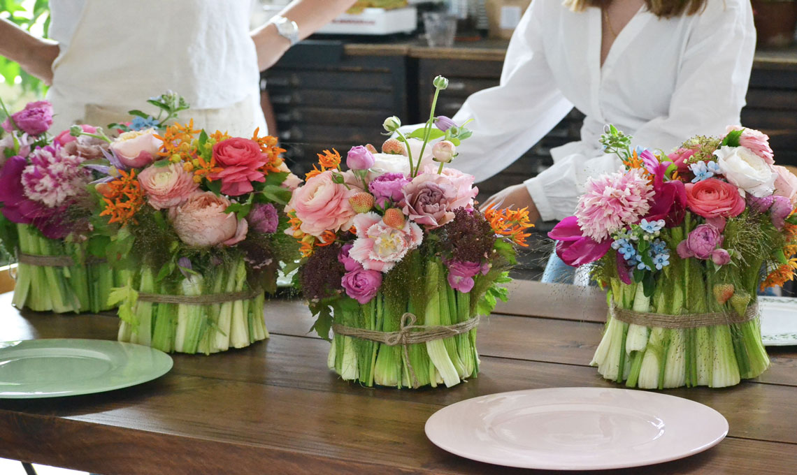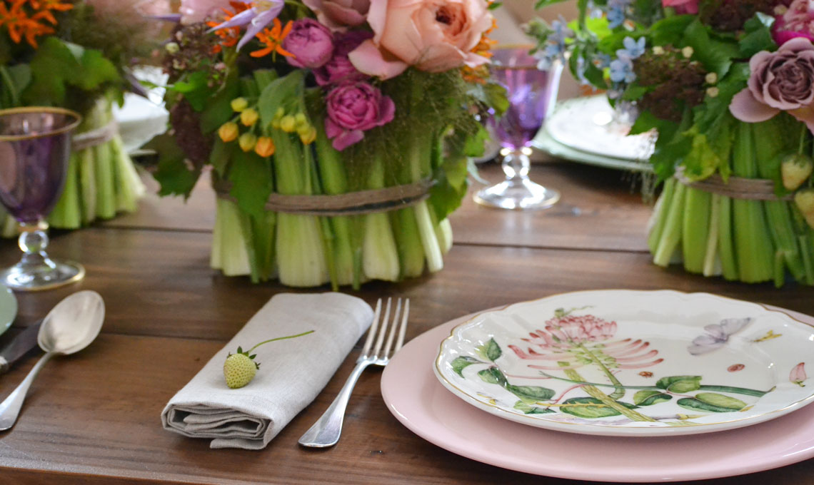 3. Scegli un centrotavola floreale, sulla tavola estiva i fiori non dovrebbero mancare mai. Non trovi un vaso adatto? Niente paura, quelli che vedi in foto sono un’idea geniale di Matteo di Flower Art Design: copri il vasetto di plastica con dei gambi di sedano, fermando poi il tutto con un giro di spago. Un’idea facile e veloce. Come disporli? Crea un runner floreale che attraversa la tavola in tutta la sua lunghezza.