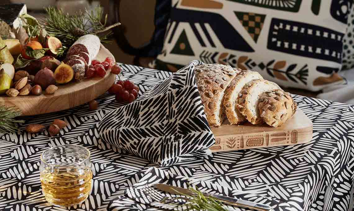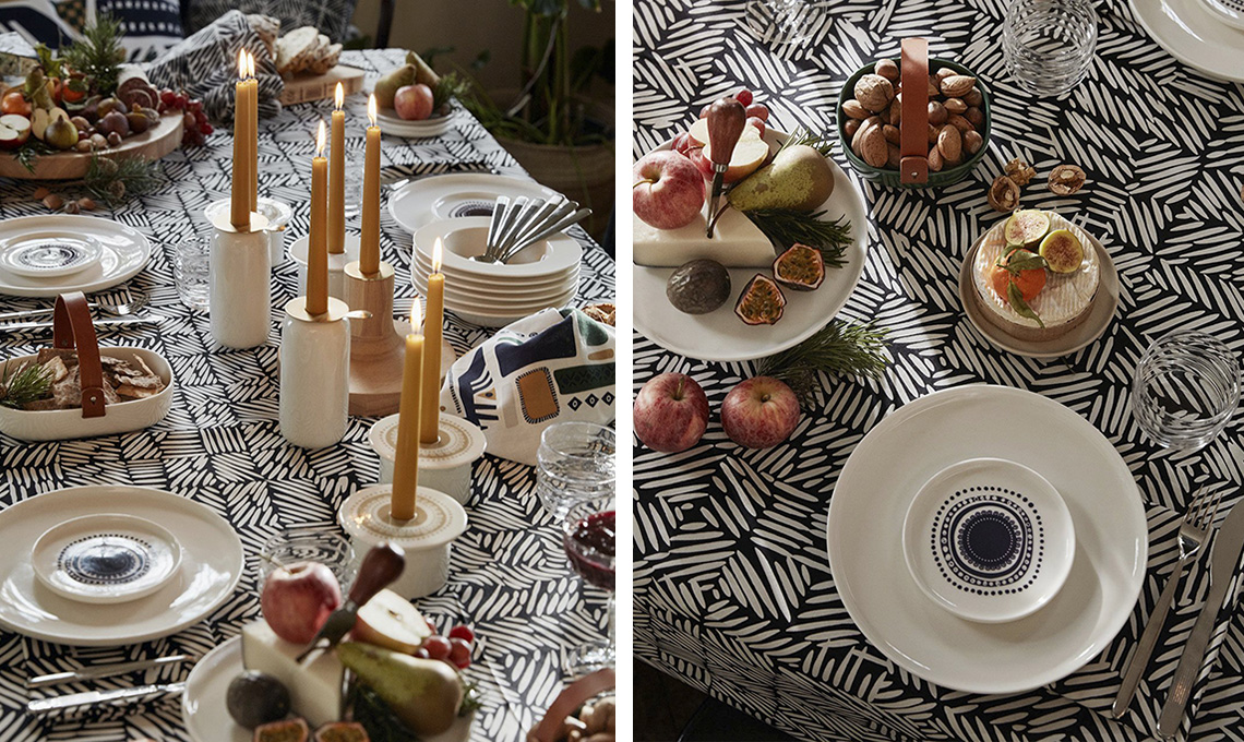 La tovaglia con stampa geometrica bianca e nera diventa la tela su cui si sovrappongono piatti bianchi in gres, grandi taglieri in legno per gli antipasti e giocosi bicchieri in vetro; a completare l’atmosfera il centrotavola con i portacandele di diverse altezze e colori e gli immancabili e morbidi cuscini.
