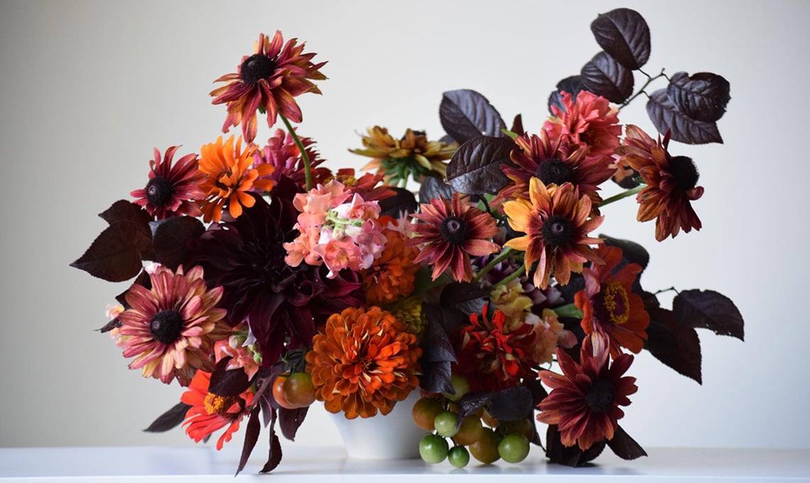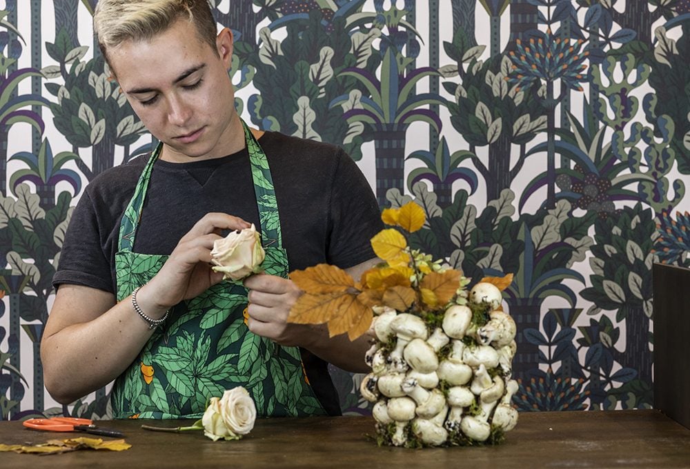 Un’altra sua caratteristica? Non stabilisce a priori forma e struttura della composizione, ma solamente la palette colori (in questo caso un’incredibile gamma di rossi autunnali): sono i fiori a dettare le regole, con il loro peso naturale, le altezze diverse e un approccio più o meno ‘ubbidiente’.