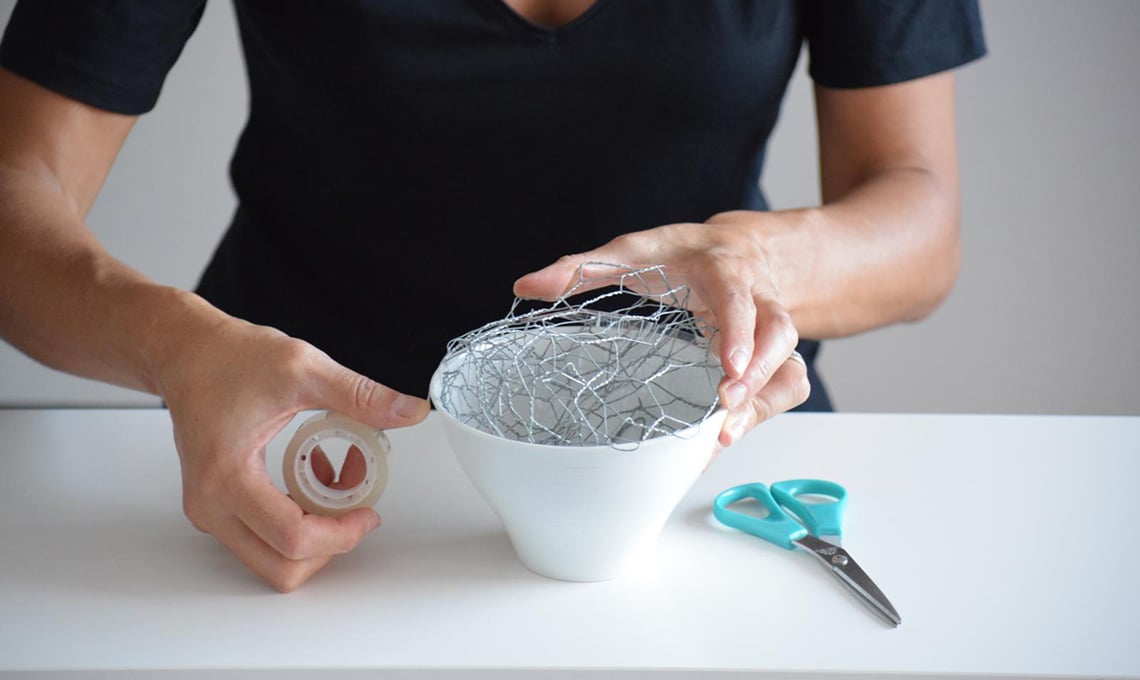 - Prendi una tazza o un recipiente abbastanza ampio e all’interno inserisci la rete da polli appallottolata.