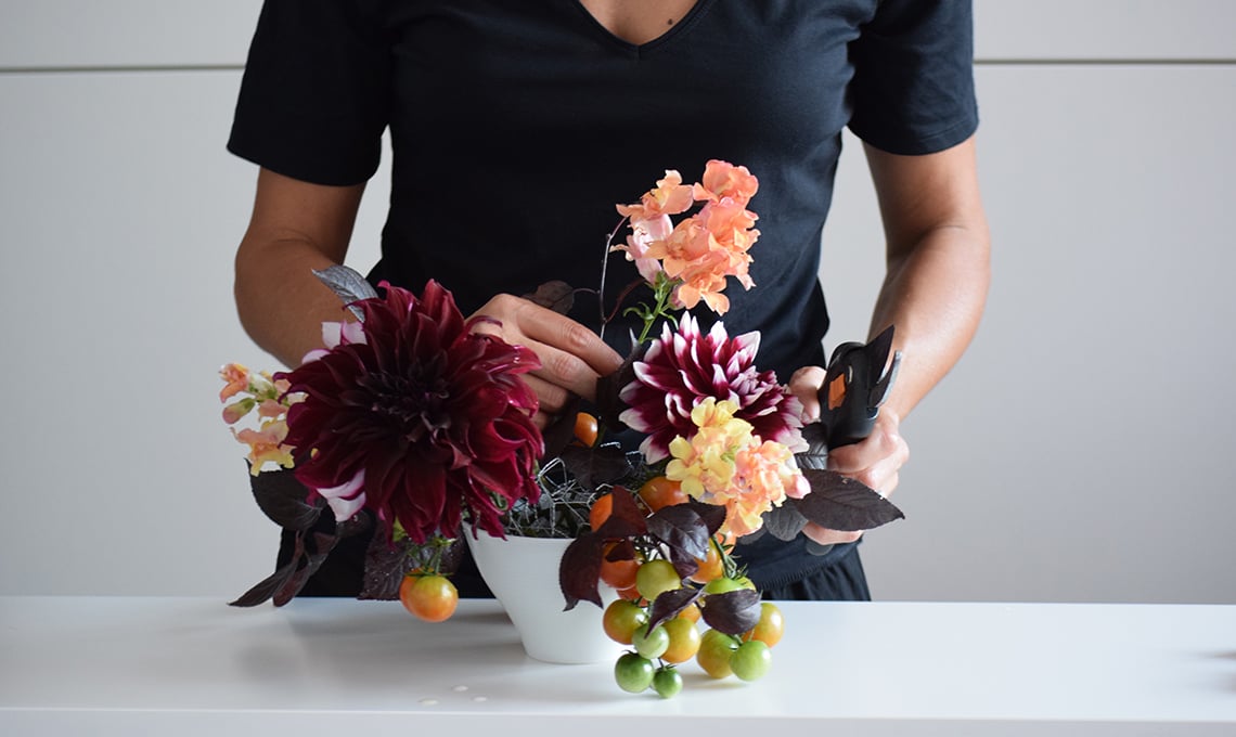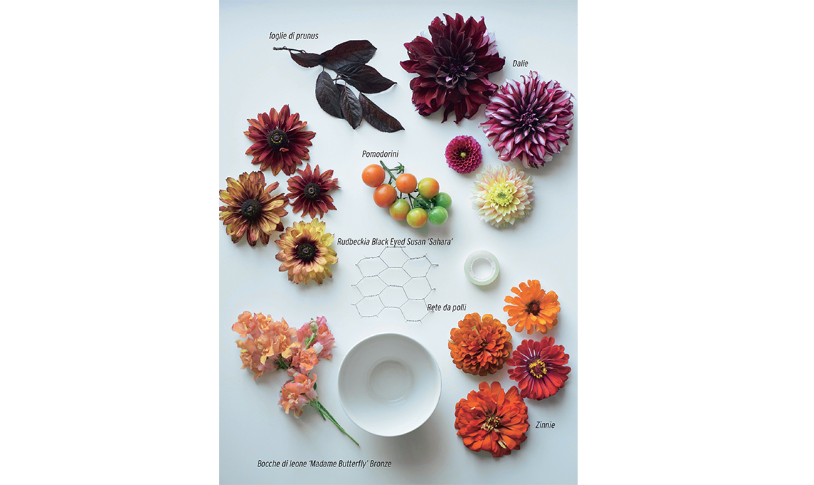 - Successivamente dovremo occuparci di posizionare i fiori più grandi e pesanti, come le dalie, poi le bocche di leone, perché sono ricadenti, e infine zinnie e rudbeckia, per riempire gli spazi e dare la forma che desideri.