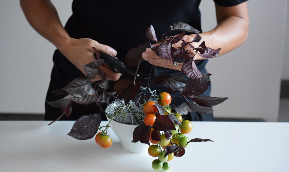Questo il suo motto, se volessimo riassumere la sua filosofia e il suo stile compositivo in una frase. Significa innanzitutto che preferisce utilizzare, quando possibile, supporti meno rigidi della spugna: perché tiene alla sostenibilità, ma anche per dare movimento, usando la rete per i polli, come vedremo più avanti nei passaggi di questo centrotavola. I fiori in questo modo possono spostarsi e acquisire un aspetto più naturale.