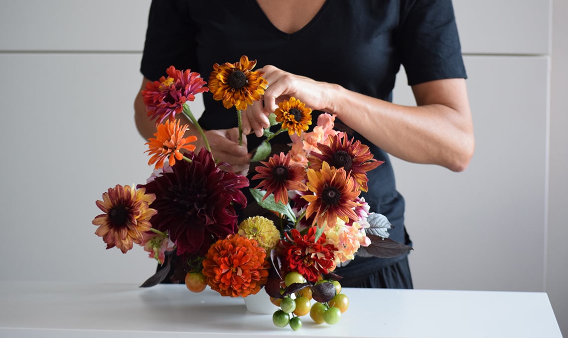 Ecco il procedimento che ha usato per creare un centrotavola dai toni autunnali, con fiori coltivati da lei e sistemati in una tazza da colazione.