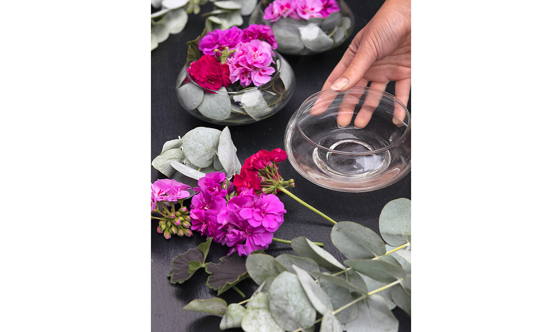 Coppette della macedonia, tea light, fruttiere e mini-insalatiere sono perfette per un centrotavola easy&quick. Metti dei cubetti di ghiaccio al centro della ciotola, inserisci lungo il bordo un ramo ‘verde’, per esempio l’eucalipto dalle foglie tonde, infine aggiungi i fiori recisi.