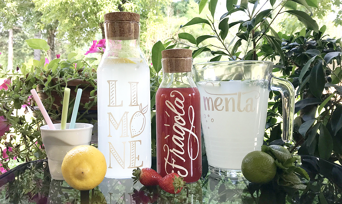 Scegli le tue bevande preferite, magari fatte in casa, e scrivi con un semplice marcatore bianco a base d’acqua l’ingrediente principale sul vetro. Puoi anche aggiungere piccoli disegni o motivi grafici oppure dargli un nome di fantasia!