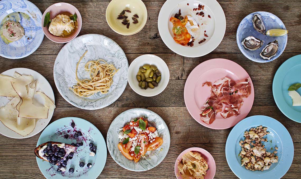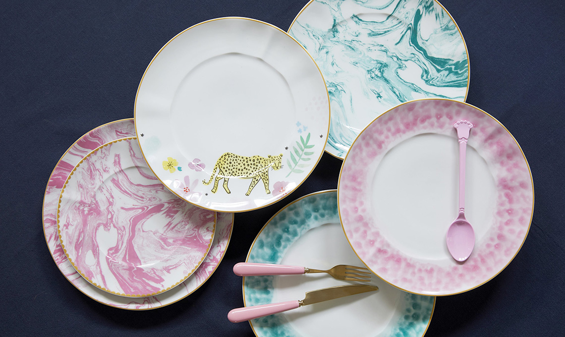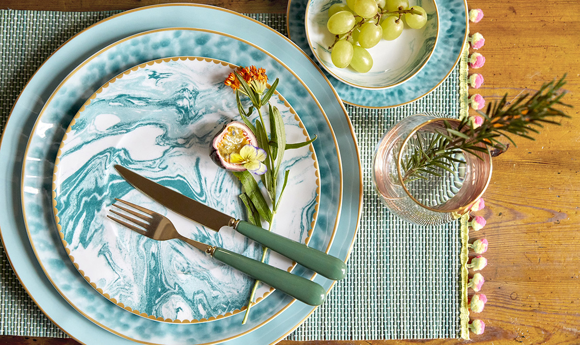 Come abbinare i piatti con stampa effetto marmo con quelli colorati per dare alla tavola uno stile ricercato ma fresco e contemporaneo.