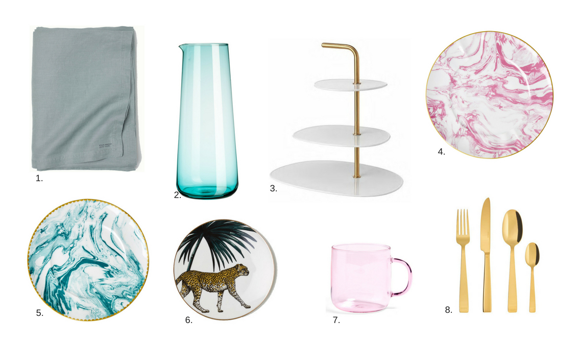 1. Tovaglia in lino lavato coloro verde nebbia [H&M, € 39,99] 2. Caraffa in vetro turchese [H&M, € 14,99] 3. Alzata a tre piani con dettagli ottone [IKEA, € 19,99] 4. Piatto in porcellana con stampa effetto marmo color bubblegum e bordo dorato, 28 cm diametro [RICE, € 19,90] 5. Piatto in porcellana con stampa effetto marmo color giada e bordo dorato, 23 cm diametro [RICE, € 16,90] 6. Piatto in porcellana con stampa ghepardo [H&M, € 7,99] 7. Mug in vetro rosa [HAY] 8. Posate linea Flat, in acciaio inox PVD colore oro [Sambonet, € 391,10 il servizio da 24 pezzi].