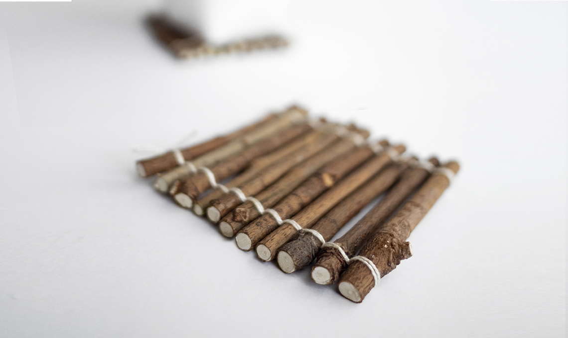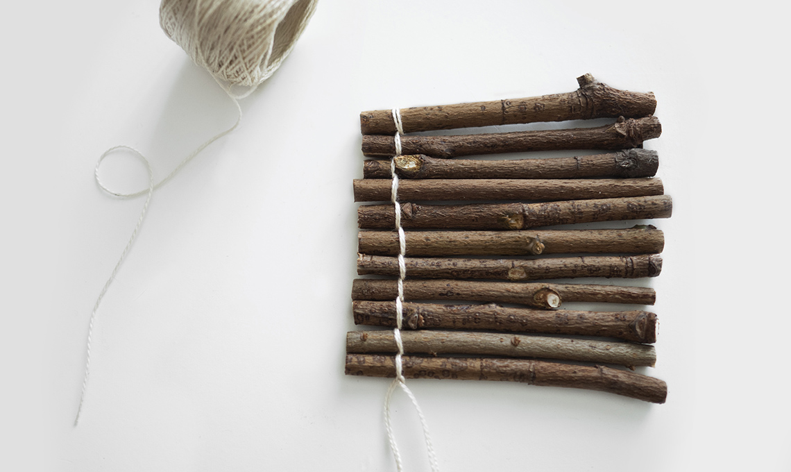 - Unisci i rametti tra loro, intrecciando il filo sopra e sotto il ramo. Infine fai un doppio nodo per bloccare il filo e tagliarne gli eccessi con le forbici. Ripeti lo stesso procedimento per il lato opposto del sottobicchiere.