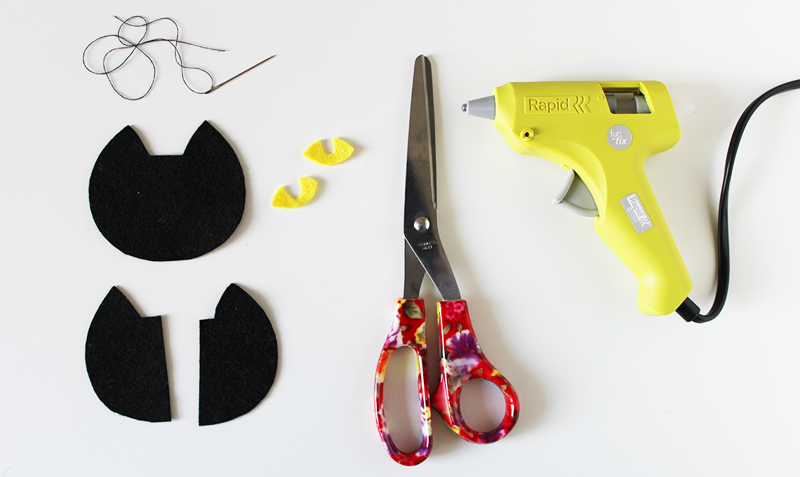 - Ritaglia dal pannolenci nero la sagoma frontale e le due parti che compongono il retro del gatto, utilizzando il pdf che avrai scaricato e stampato su A4. Ritaglia gli occhi dal pannolenci giallo.