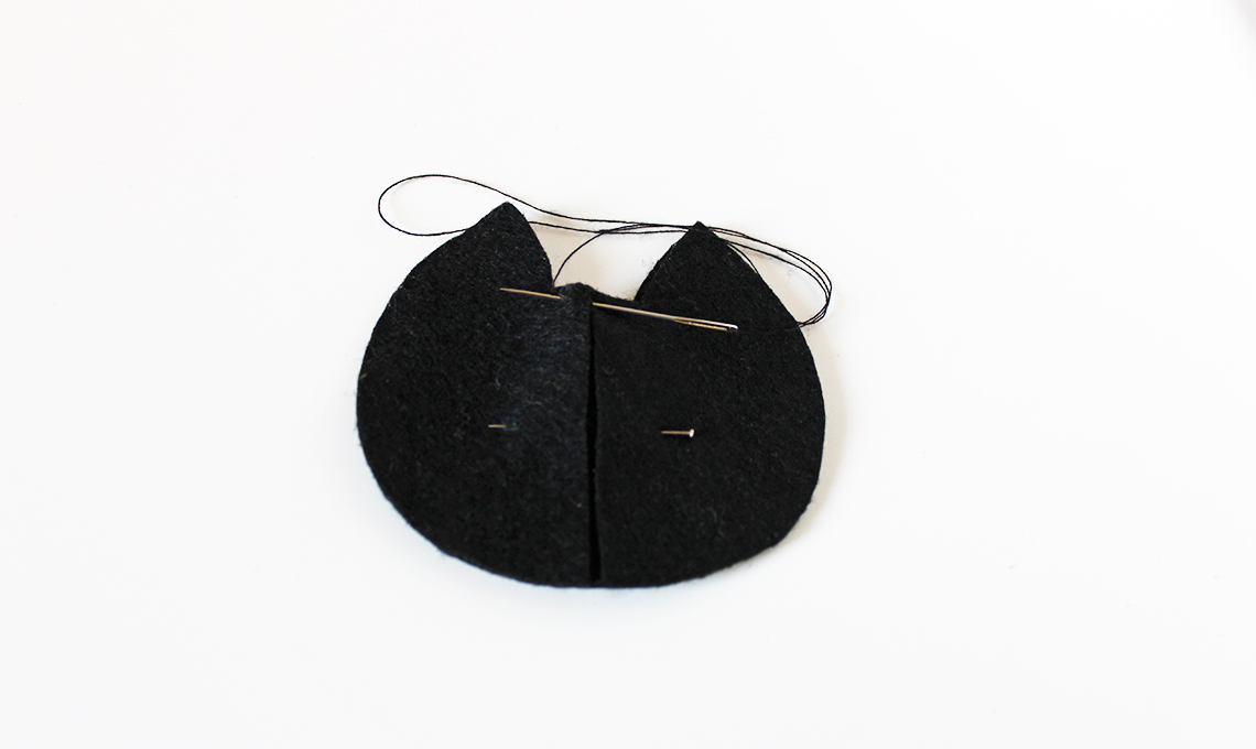 - Sovrapponi fronte e retro del gatto, posando le due metà che compongono il retro sopra la sagoma intera del fronte. Nel caso decidessi di utilizzare la macchina da cucire o di cucire a mano, ferma con due punti di imbastitura le due metà del retro alla sagoma frontale per tenerle ben ferme, e poi procedi nel cucire lungo tutto il bordo lasciando un margine di qualche millimetro. Altrimenti puoi tranquillamente utilizzare la colla a caldo incollando lungo tutto il bordo. Non incollare la linea che divide a metà il retro, sarà l’apertura per infilare i dolcetti.