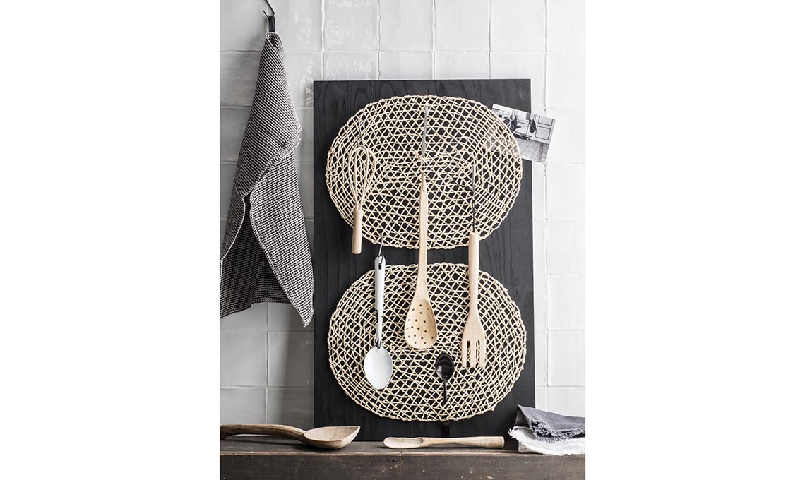 Le classiche tovagliette americane intrecciate di fibre naturali lasciano le mise en place outdoor e ‘vestono’ la casa: con pochi punti di cucito diventano un comodo portautensili