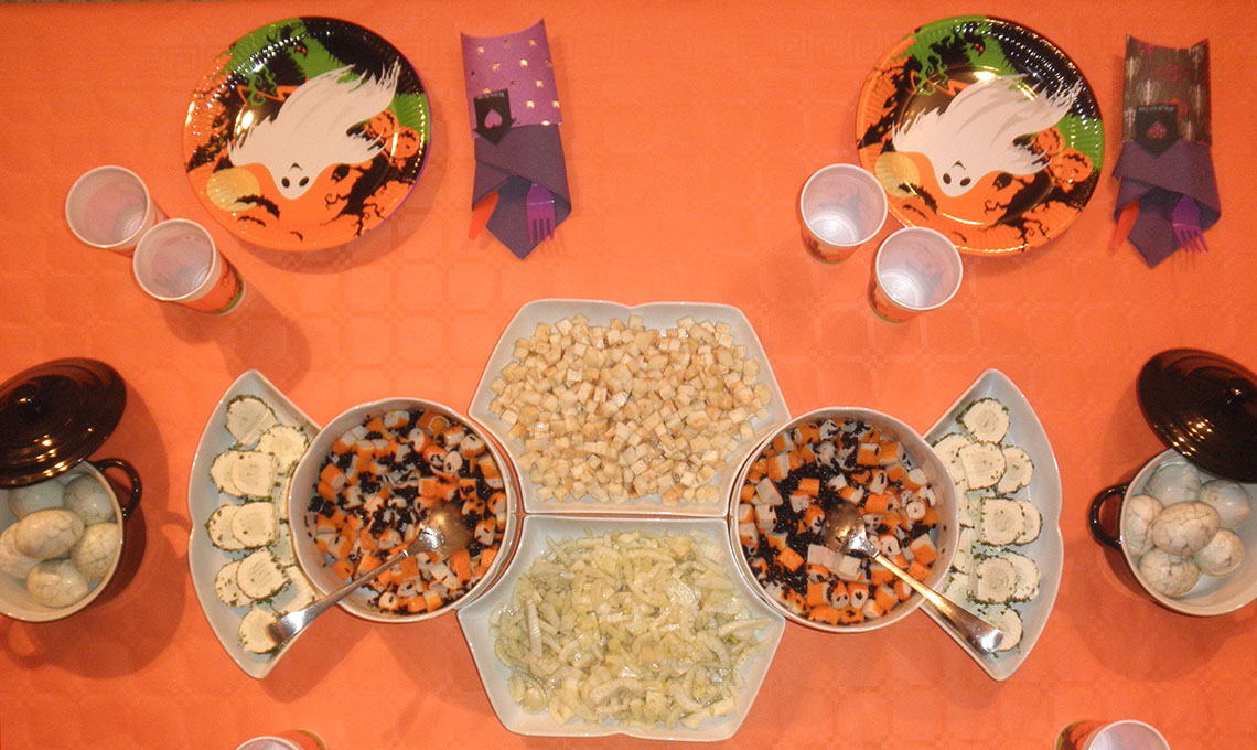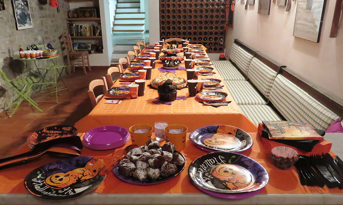 Per me è una sorta di carnevale d’autunno e mi dà lo spunto per una cena a tema, dalla quale sono bandite le portate con allusioni macabre come dita della strega e ossa dei morti, ma nella quale si mangiano solo cose bianche, nere, arancione, verde lime e viola. La mise en place segue lo stesso filo conduttore, come il dress code: maschere e colori coordinati!