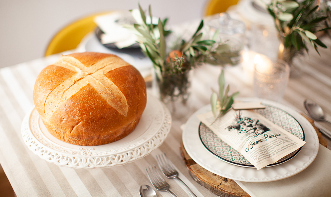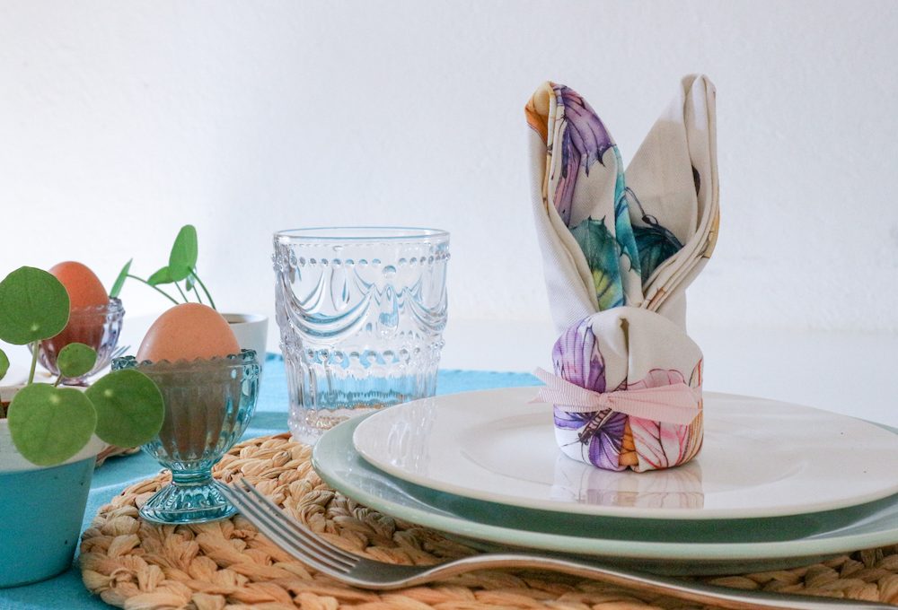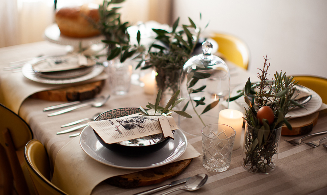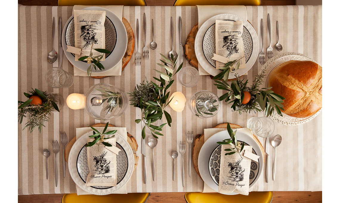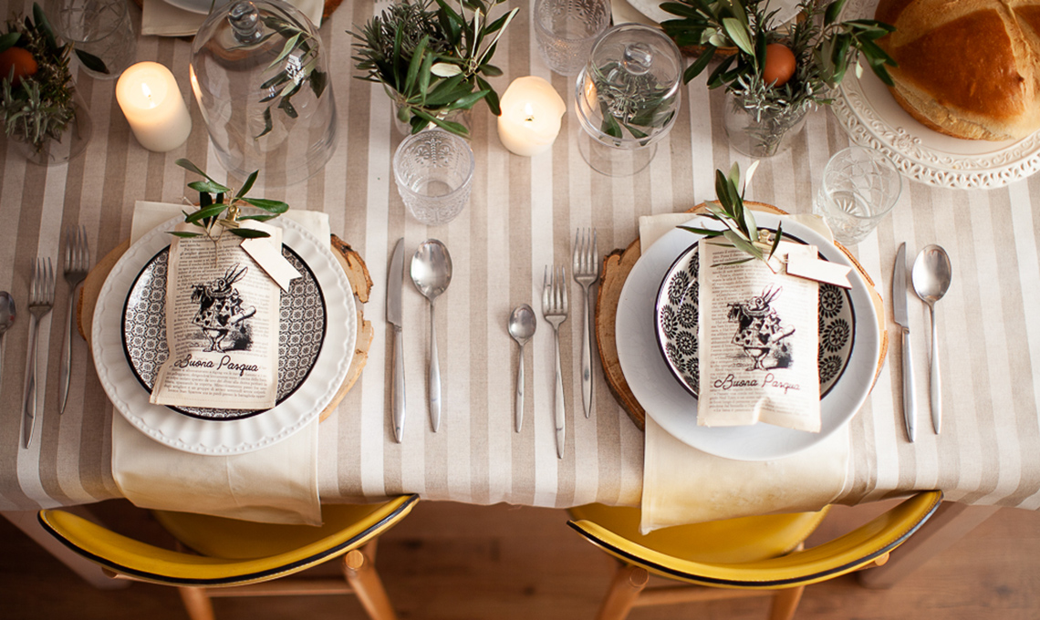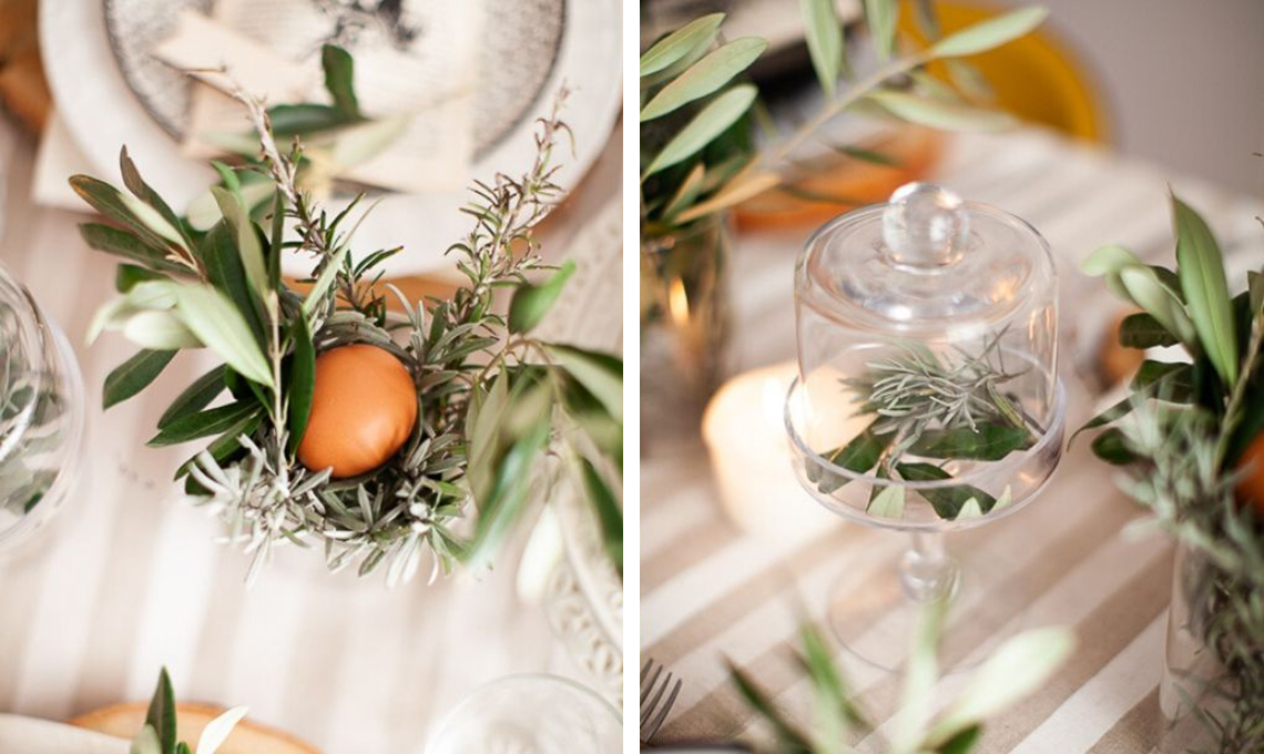 Non importa quale sarà il colore o il motivo della tovaglia che sceglierai per allestire il tavolo di Pasqua...quello che è certo è che non deve assolutamente mancare un tocco di verde! Appoggia i rami al centro del tavolo, disponendoli in tutta la sua lunghezza oppure racchiudi il verde in piccoli vasetti e disponili ordinatamente. Ulivo, lavanda e rosmarino compongono il mix che abbiamo scelto per il nostro tavolo.