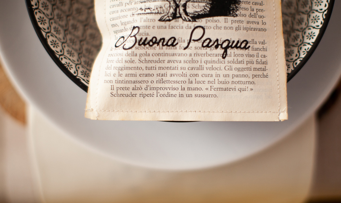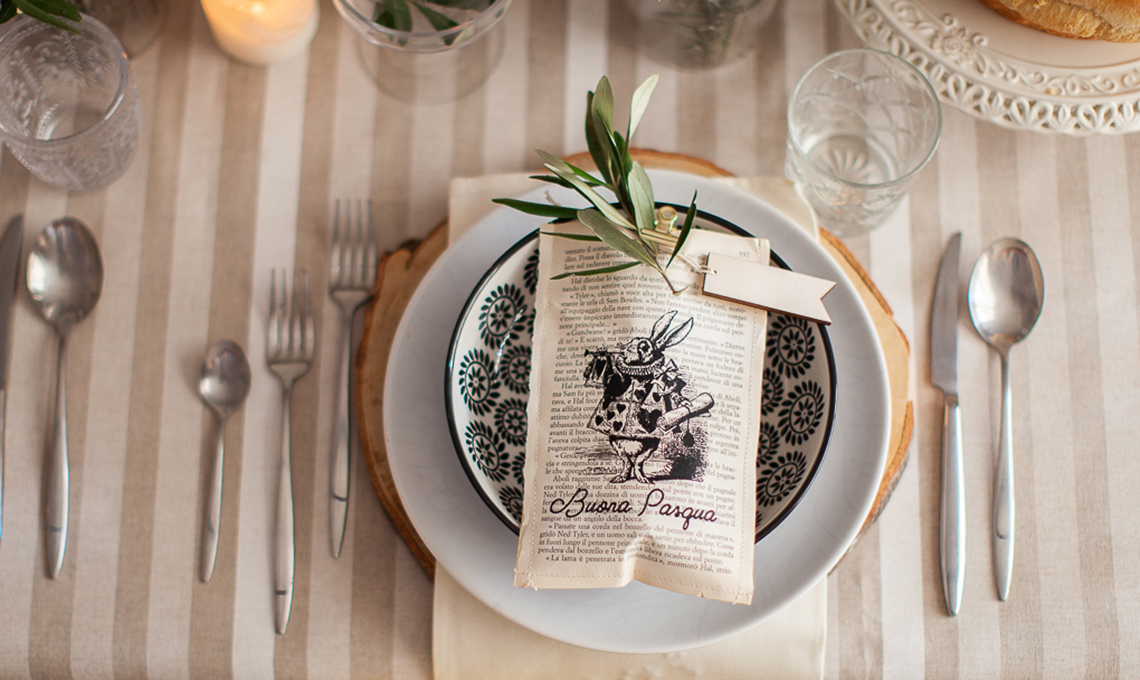 Vuoi un'idea originale per i segnaposto? Scarica e stampa il pdf , ritaglialo e appoggialo su ogni piatto. Se ti piace cimentarti con la macchina da cucire, stampalo su una carta particolare (noi abbiamo riciclato le pagine di un vecchio libro caduto in disgrazia), doppialo con un secondo foglio di carta e cucili assieme su tre lati. Riempi il sacchettino di uova di cioccolato e chiudi l'apertura con la macchina da cucire. Sarà un pensiero gradito per i commensali.