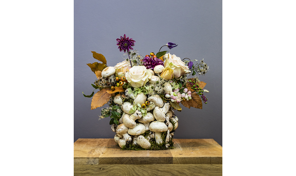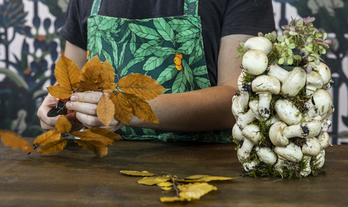 Come nel caso del centrotavola autunnale di fiori e funghi nella foto, che puoi realizzare così.