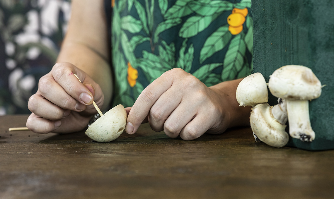 - Taglia a metà 12 funghi, in senso longitudinale.