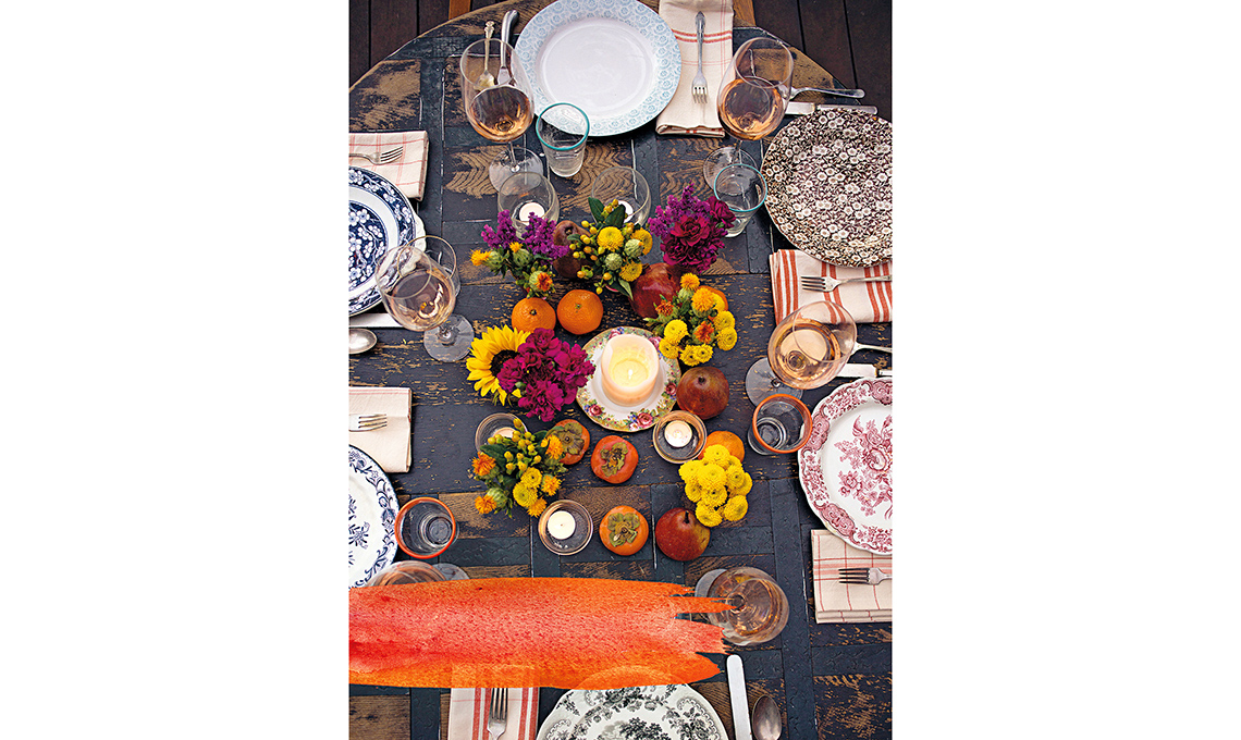 Il centrotavola racconta la stagione e i suoi colori con fiori, frutta e candele bianche in una calda palette di arancio, rosso e giallo. Sulla terrazza di un vecchio chalet, nel cuore della foresta a poche miglia dall’oceano di San Francisco, Erin Gleeson prepara spesso tavole come questa. Fotografa, impiatta ricette vegetariane e primizie di stagione, organizza eventi, dipinge acquerelli ispirati alla vallata di sequoie centenarie che ha decretato il nome del suo blog, The Forest Feast, e dei suoi libri di cucina (3 in tutto!).