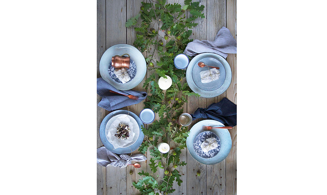 Il runner di foglie, i tovaglioli spaiati ma in nuance e un regalo come segnaposto: ecco una indimenticabile ‘mise en place’ invernale!