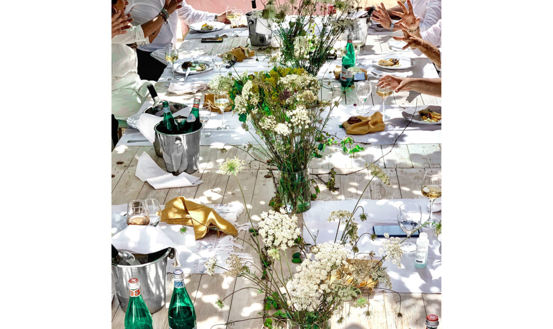 Masseria Potenti (a Manduria, Taranto) nasce dall’amore per la tavola e per la convivialità e ha risposto alle esigenze del distanziamento sociale con tavoli profondi e doppi, allestiti all’ombra di un fico secolare.