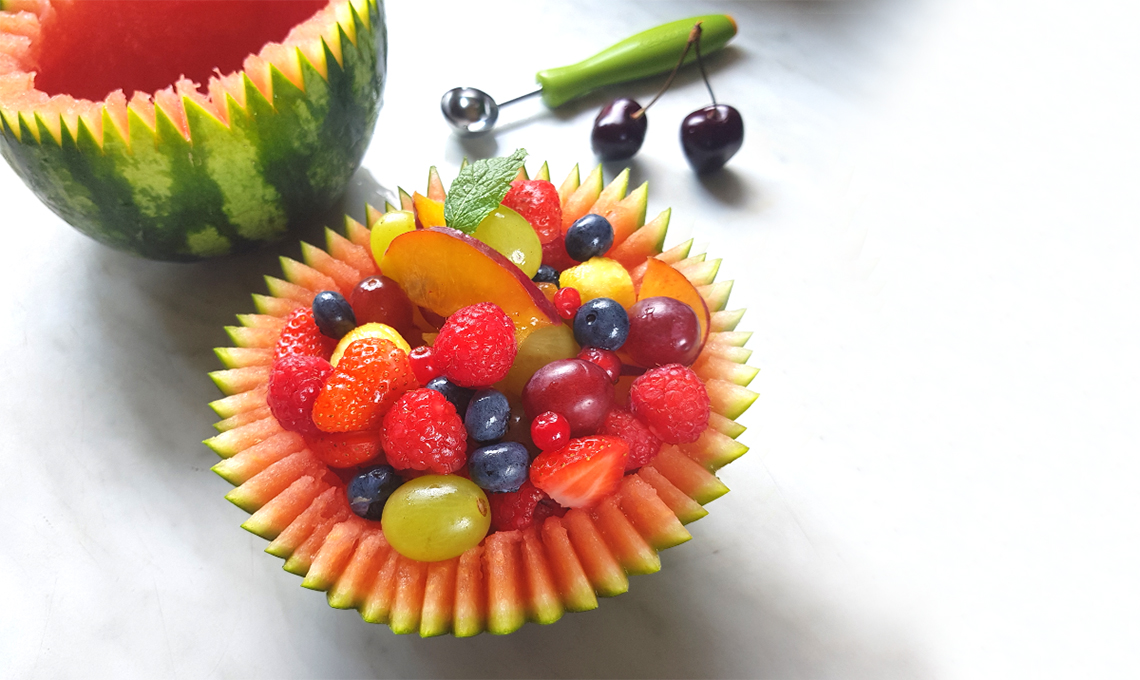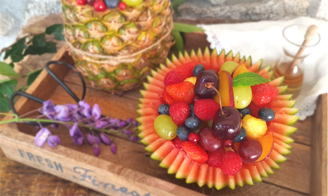 Aperitivi e merende, cene in piedi e brunch sono la situazione ideale per presentare e proporre la frutta di stagione nei 'contenitori' di frutta. Ecologici e biodegradabili, richiedono pochi minuti per la preparazione.