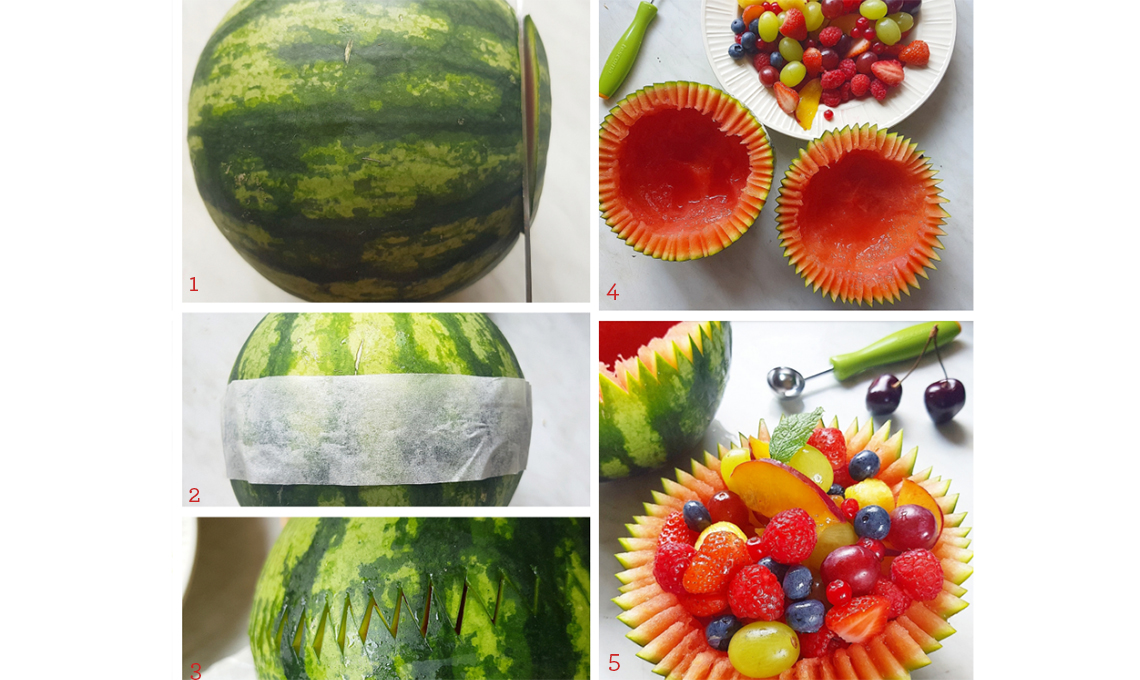 - Prova ad incidere con un coltello spelucchino la buccia a zig zag (utilizza uno scotch di carta per creare una linea da seguire intorno al frutto, sarà più semplice terminare l'incisione da dove sei partiti) affondando la lama in profondità e dividendo il frutto otterrai un bordo smerlato effetto 'wow' (vedi foto).