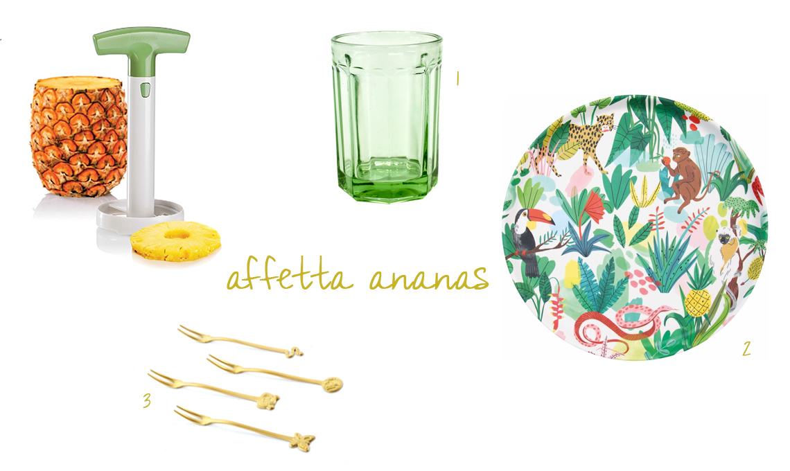 Affetta Ananas [€9,90 Tescoma], (1) bicchiere in vetro verde [Serax €13], (2) Piatto decorato [Klevering €19], (3) Set di forchettine party fashion [Sambonet €24,90 set da 4]