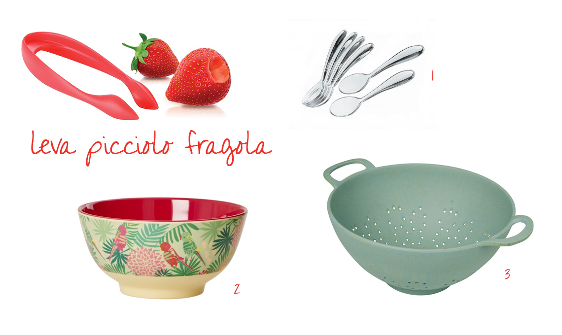Snocciola ciliegie [€ Linea Handy € 22,90 - linea Delicia € 11,90 - Tescoma], (1) ciotola rosa smaltata [Hay €19], (2) coppetta macedonia Boston [Villery & Boch €15,90], (3) mini forchette in bambù [Maison du monde €2,99]