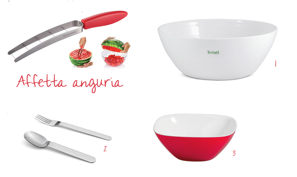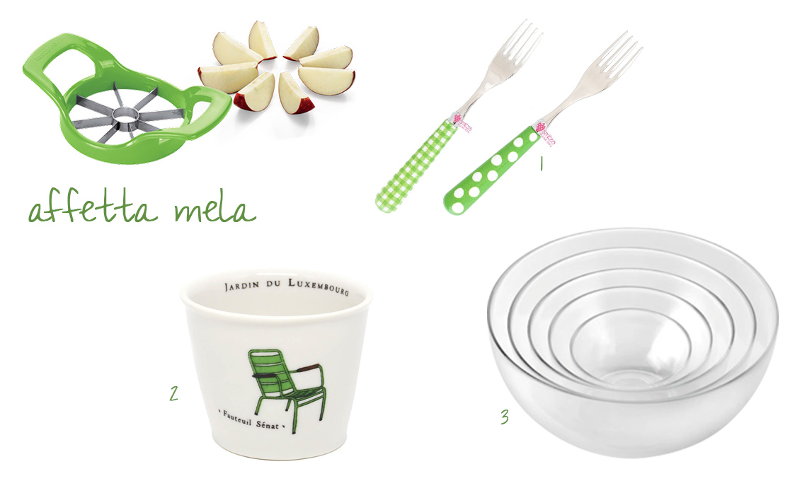 Affetta mela [€5,90 Tescoma], (1) posate [Smilza-a great story su gallinasmilza.it €5 l'una], (2) bicchiere Jardin du Luxembourg [Alix D. Reynis €29], (3) Ciotole in vetro varie misure [Tescoma da €4,90]