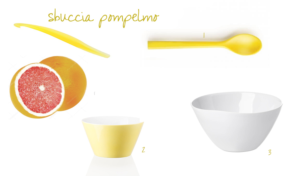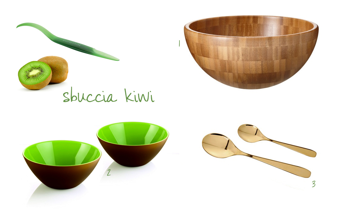Sbuccia kiwi [€4,90 Tescoma], (1) ciotola in lengo di bambù Blanda Matt [Ikea €9,99], (2) ciotole dessert linea My fusion [Guzzini €19 set 2], (3) cucchiai Tillagd [set posate da 24 pz €59,99]