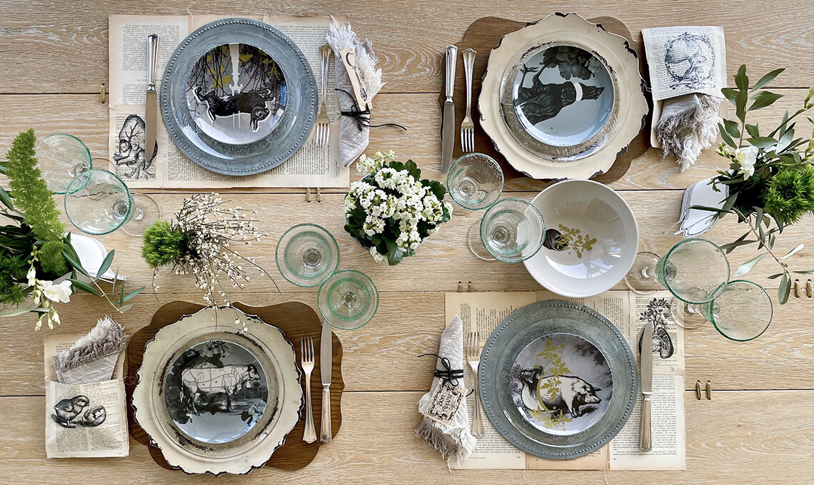 Francesca, sensibile al tema animalista, mette al centro della sua mise en place i piatti dell’artista Rachel Convers, dove le illustrazioni di animali e vegetali sono la rievocazione di quel mondo rurale, spesso crudo e pragmatico, oggi scomparso, delle fattorie dei nostri bisnonni.