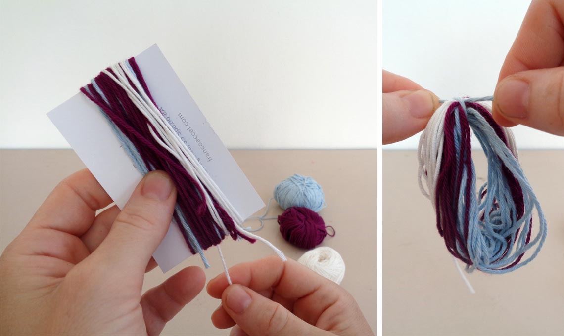 - Per prima cosa si crea la nappina: avvolgi più giri di cotone intorno ad un cartoncino; puoi usare anche più colori.