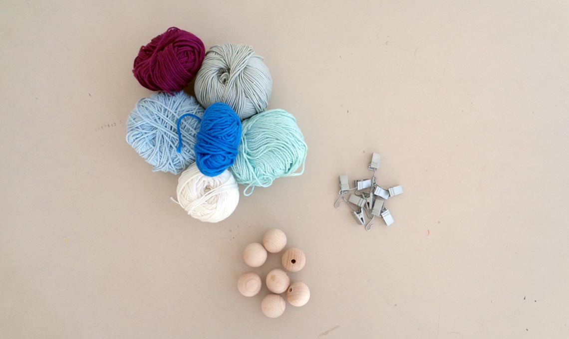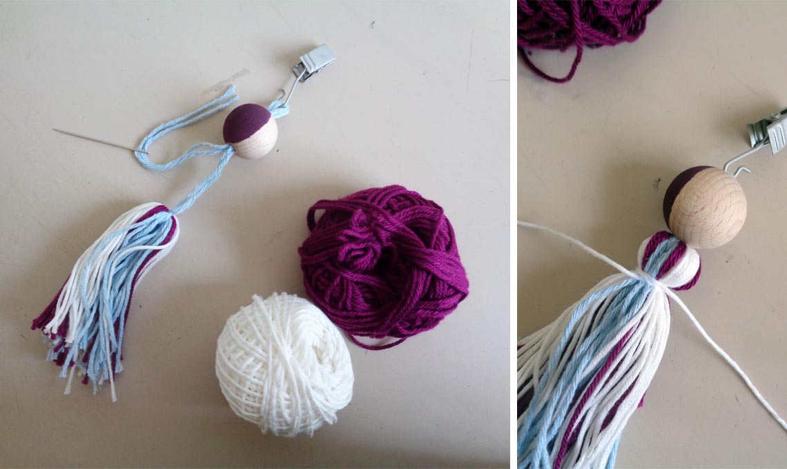 - Infila le estremità del filo con cui hai legato la matassa in un ago, fai passare la perla di legno (eventualmente decorata con tempera acrilica) e il gancio della mollettina, e infilalo di nuovo nella perla;
