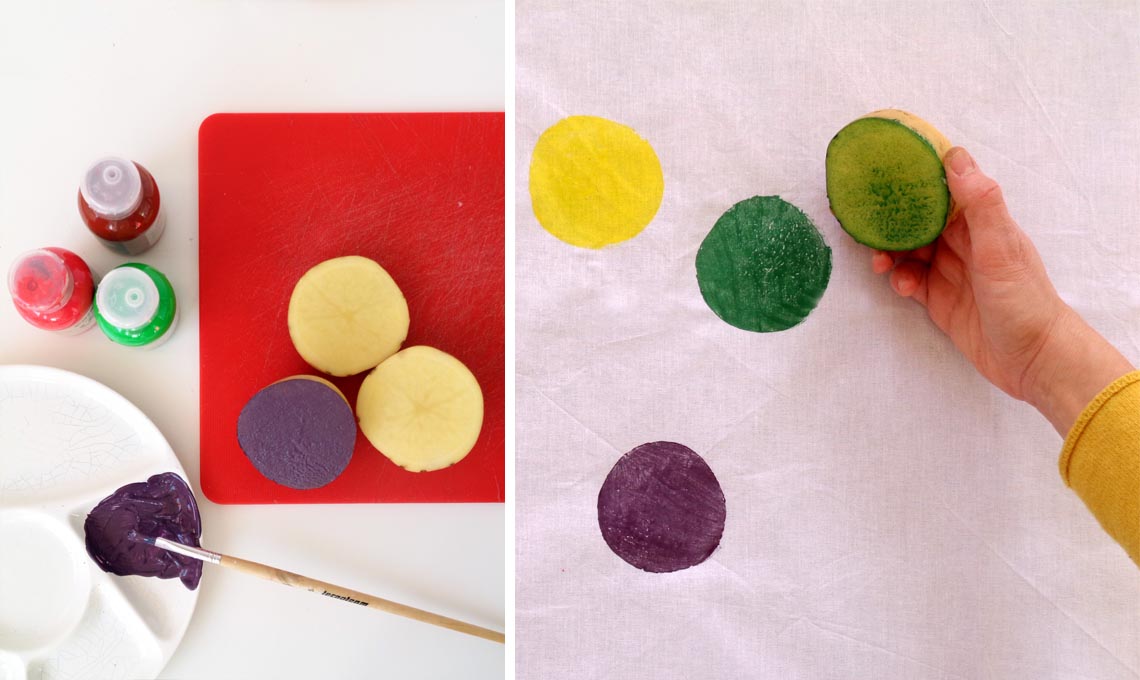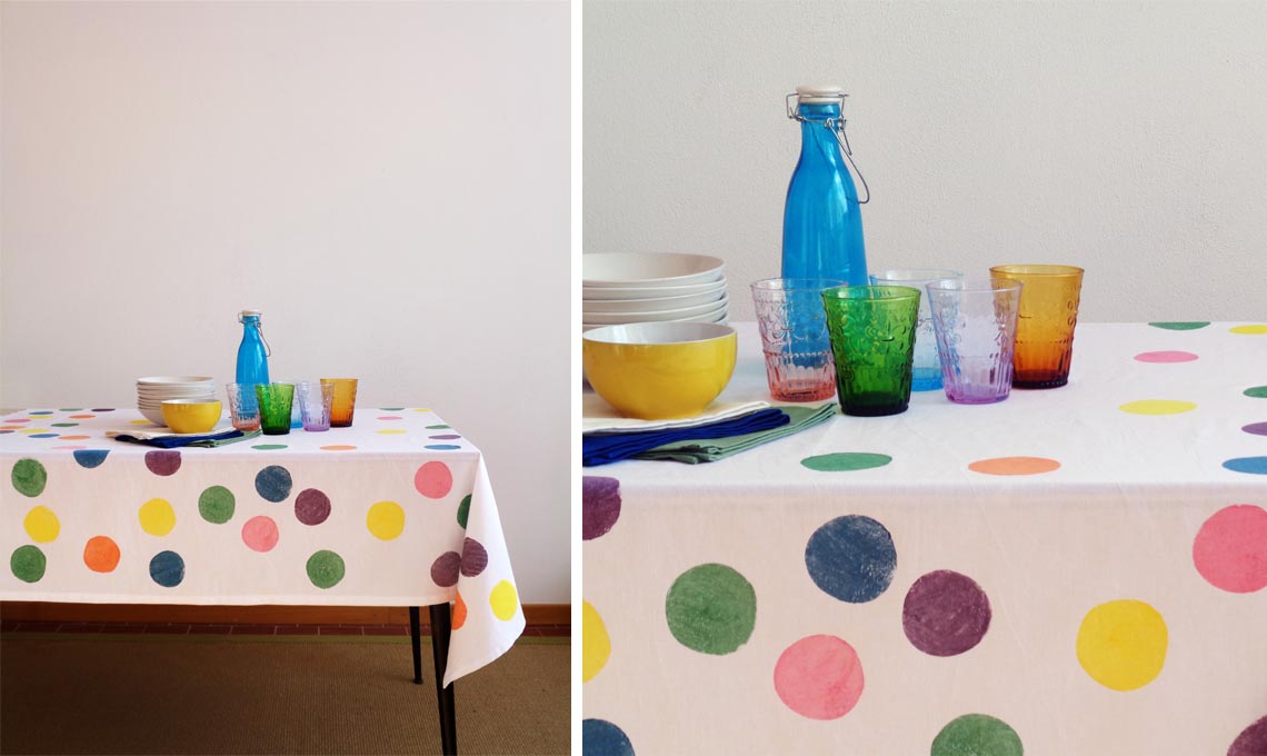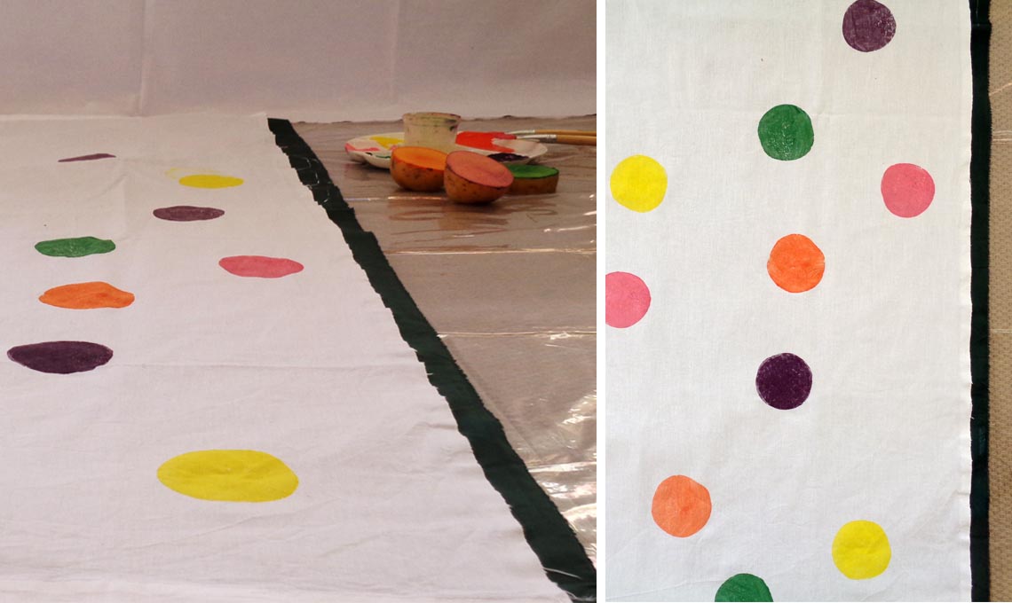 In questo caso, ho stampato una semplice tovaglia bianca, utilizzando l'impronta delle patate per creare grossi e colorati pois.