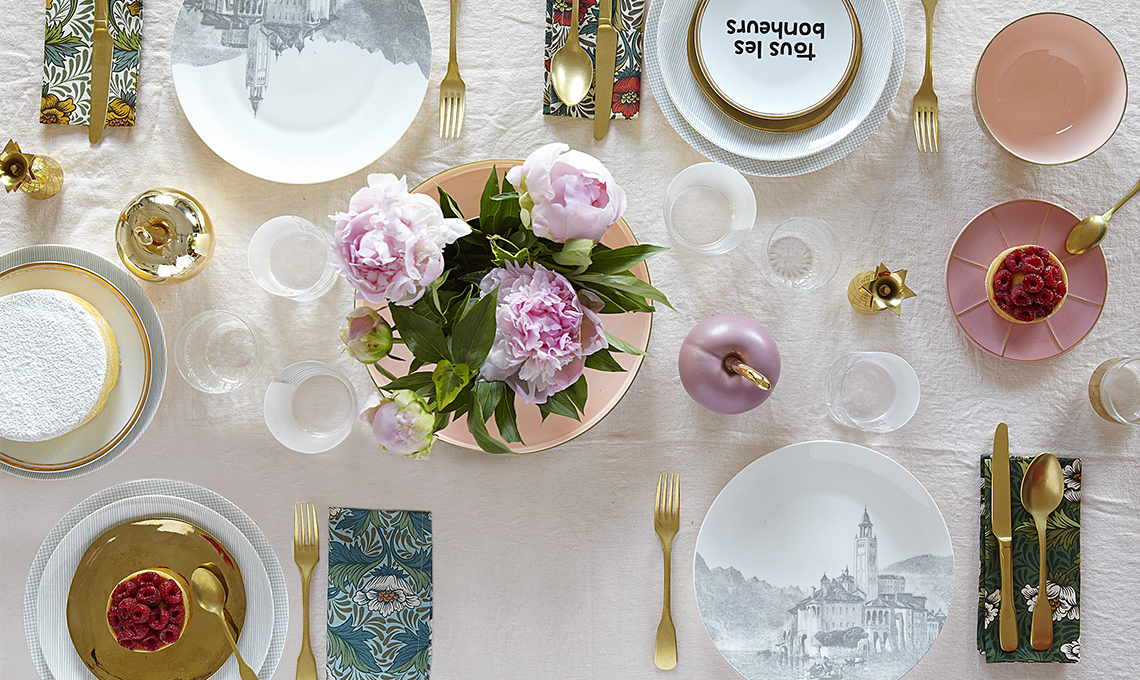 Effetto super specchiato per cucchiaio e forchetta Linear Gold [Sambonet €449,90 il set da 24 pezzi], piatto TAC Palazzo Roro [Rosenthal €36].