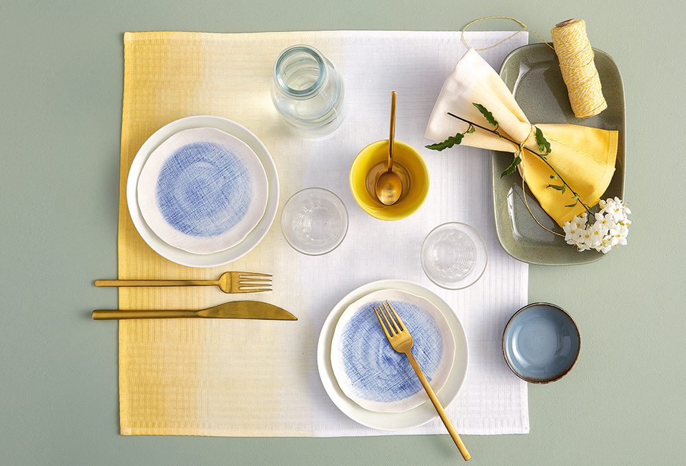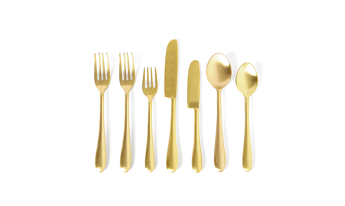 In metallo spazzolato, il servizio Due Ice Oro Brushed Satin [Mepra €80,70 il set da 4 pezzi];