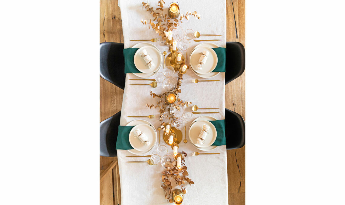 Bianco candido, qualche tocco di elegante verde bottiglia e un fiume di eucalipto dorato che scorre sinuoso, acceso dalla luce discreta delle candele. Ma sulla tavola rigorosa spunta un elemento sbarazzino: i ‘crackers’, elementi tipici delle feste anglosassoni. Sono pacchettini a forma di caramella che al proprio interno nascondono coriandoli, dolcetti, piccoli pensierini o monete. A fine pasto, si aprono tutti insieme: si sceglie una coppia e ciascuno tira un estremo del pacchetto... una vera esplosione di festa e allegria!