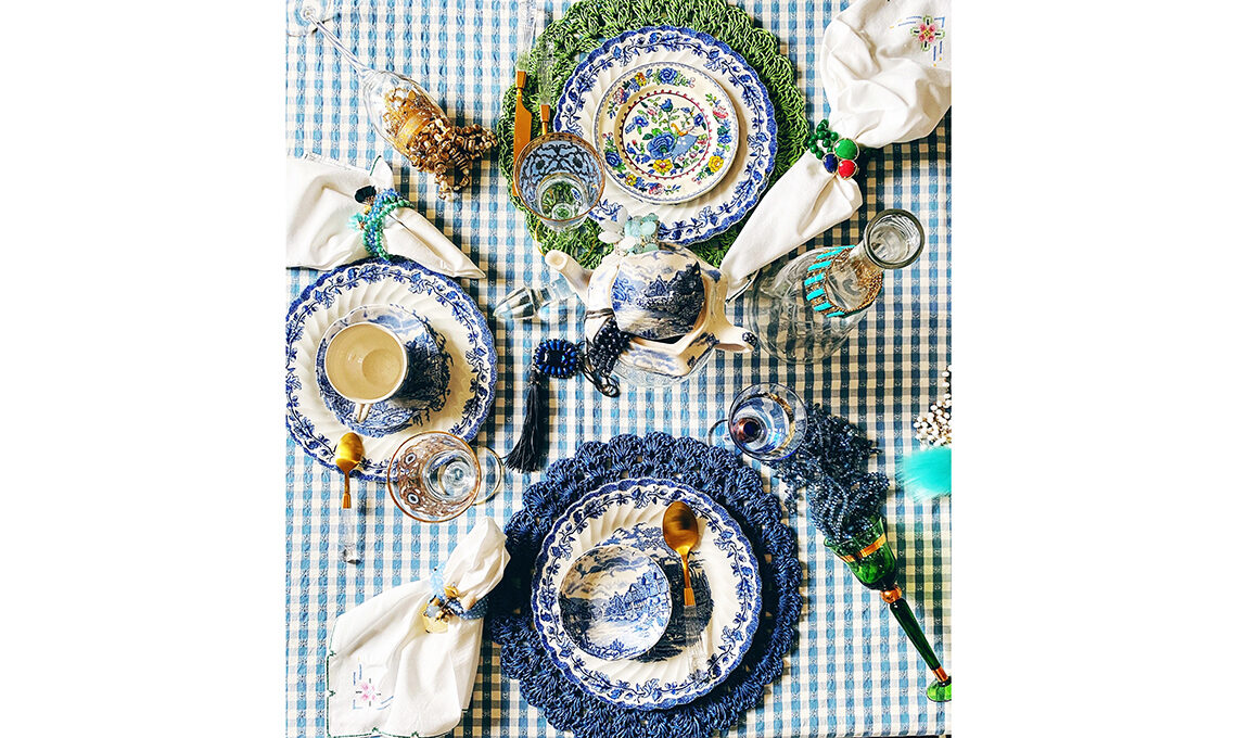La tavola di questo mese è di Monica Di Felice che, per la sua tavola di famiglia, ha scelto dei pezzi diametralmente opposti per provenienza e mood, che si bilanciano a vicenda. I bicchieri bordati d’oro ti sembrano troppo classici? Ecco che sulla tovaglia a motivo Vichy perdono un po’ del loro ‘spirito barocco’. I centrini sono troppo démodé? Se lavorati con colori inediti e abbinati a portatovaglioli gioiello, si alza il loro tasso creativo. centrini [Villa d’Este Home Tivoli], posate [Baci Milano].