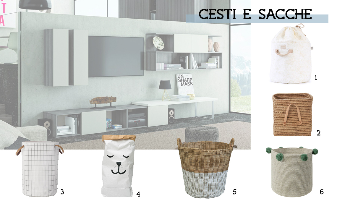 Se ami questo tipo di soluzione sono ideali quelli grandi e davvero capienti che possono contenere anche pupazzi e giochi di grandi dimensioni. [1] Borsa porta giocattoli Bamboo Bubble di Nobodinoz (50€), [2] il cesto in rafia di Rice (40€), [3] il cesto grande di Ferm Living (70€), [4] la sacca Orso addormentato di Telkiddo (19€), [5] il cesto bicolore di Numero 74 (53€) e [6] il cesto Bubble verde di Lorena Canals (40€).