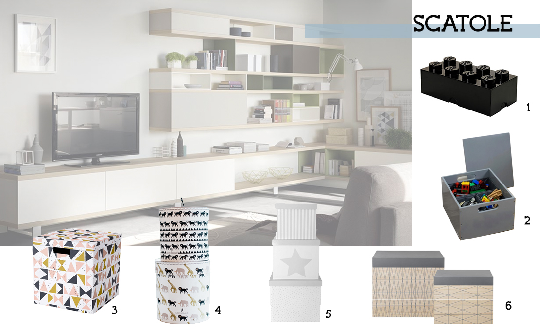 Se preferisci una soluzione con coperchio, punta sulle scatole. Le trovi in plastica, stoffa, cartone e legno. [1] Mattoncino contenitore a 8 bottoni di Lego (35€), [2] Contenitore in legno di Tidy Books (69€), [3] Scatola in cartone Tjena di Ikea (4,99€), [4] Scatole Safari di Lilys Island (15,50€), [5] Tris di scatole di JaBaDaBaDo (35€) e [6] Scatole in legno di Bloomingville (78€).