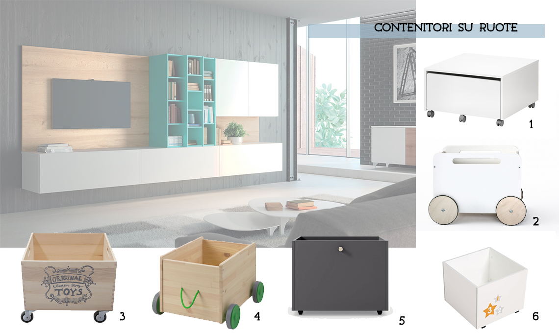 Se preferisci una soluzione facile da spostare, punta sui contenitori muniti di ruote. [1] Contenitore con ruote Släkt di Ikea (50€), [2] Contenitore su ruote Ooh Noo (99€), [3] Scatola per giochi di Wooden Story (121€), [4] Portagiochi su ruote Flisat di Ikea (29,99€), [5] Contenitore Tynn su ruote di Nidi (da 79€) e [6] Portagiochi su ruote in legno di Roba (29,90€).
